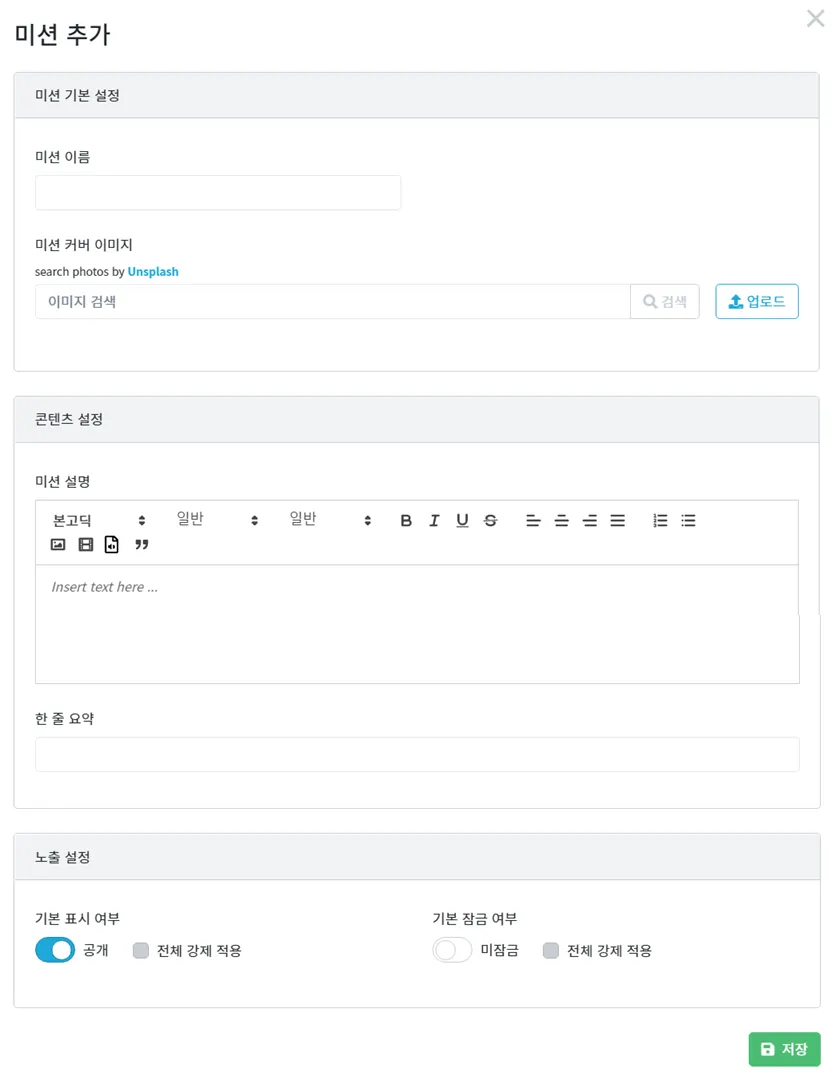 미션 이름, 커버 이미지, 본문 내용 등을 작성하고 저장합니다.