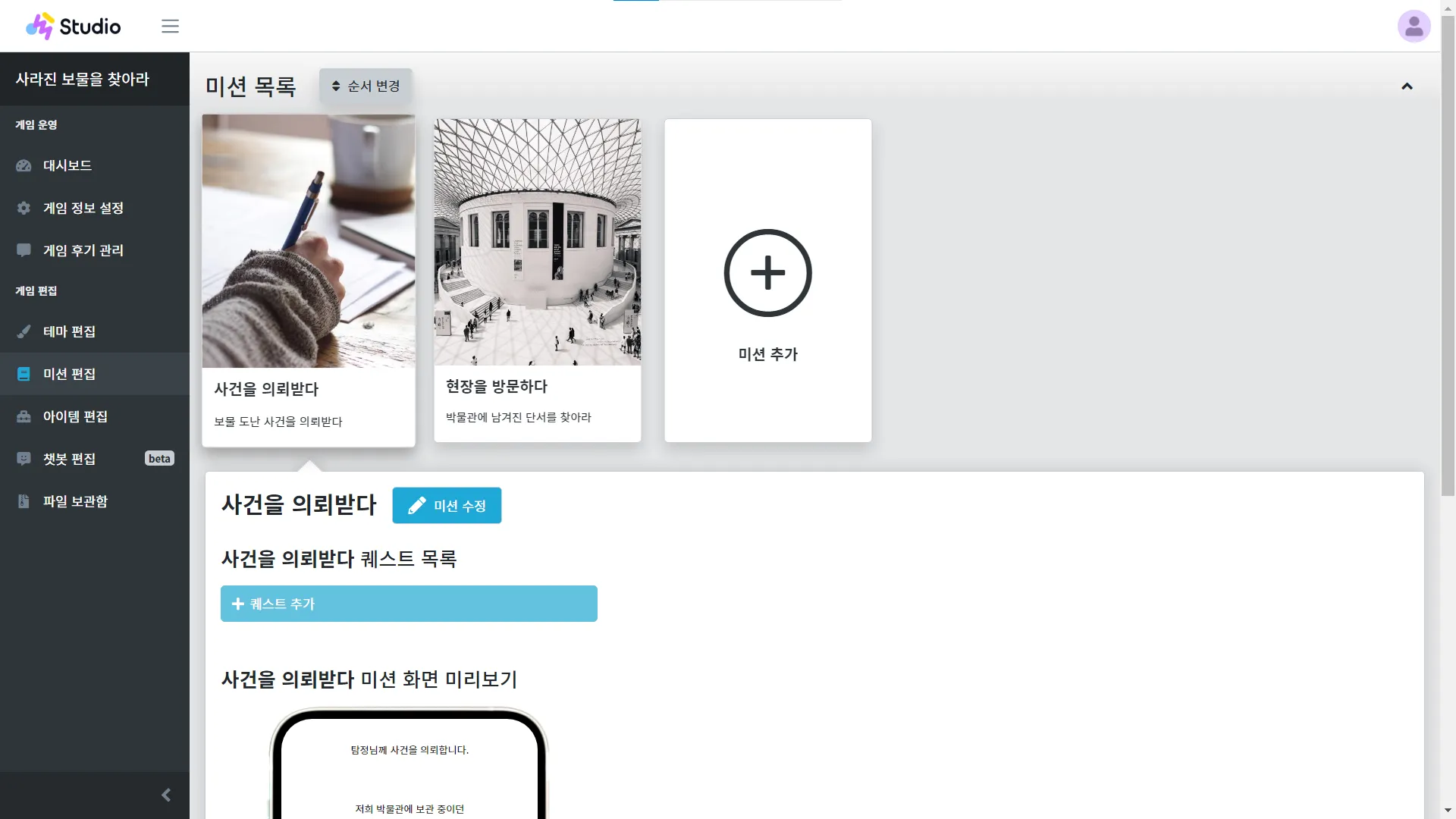 미션을 필요한만큼 미리 만든 후 퀘스트를 생성해야 조금 더 편하게 작업할 수 있습니다.