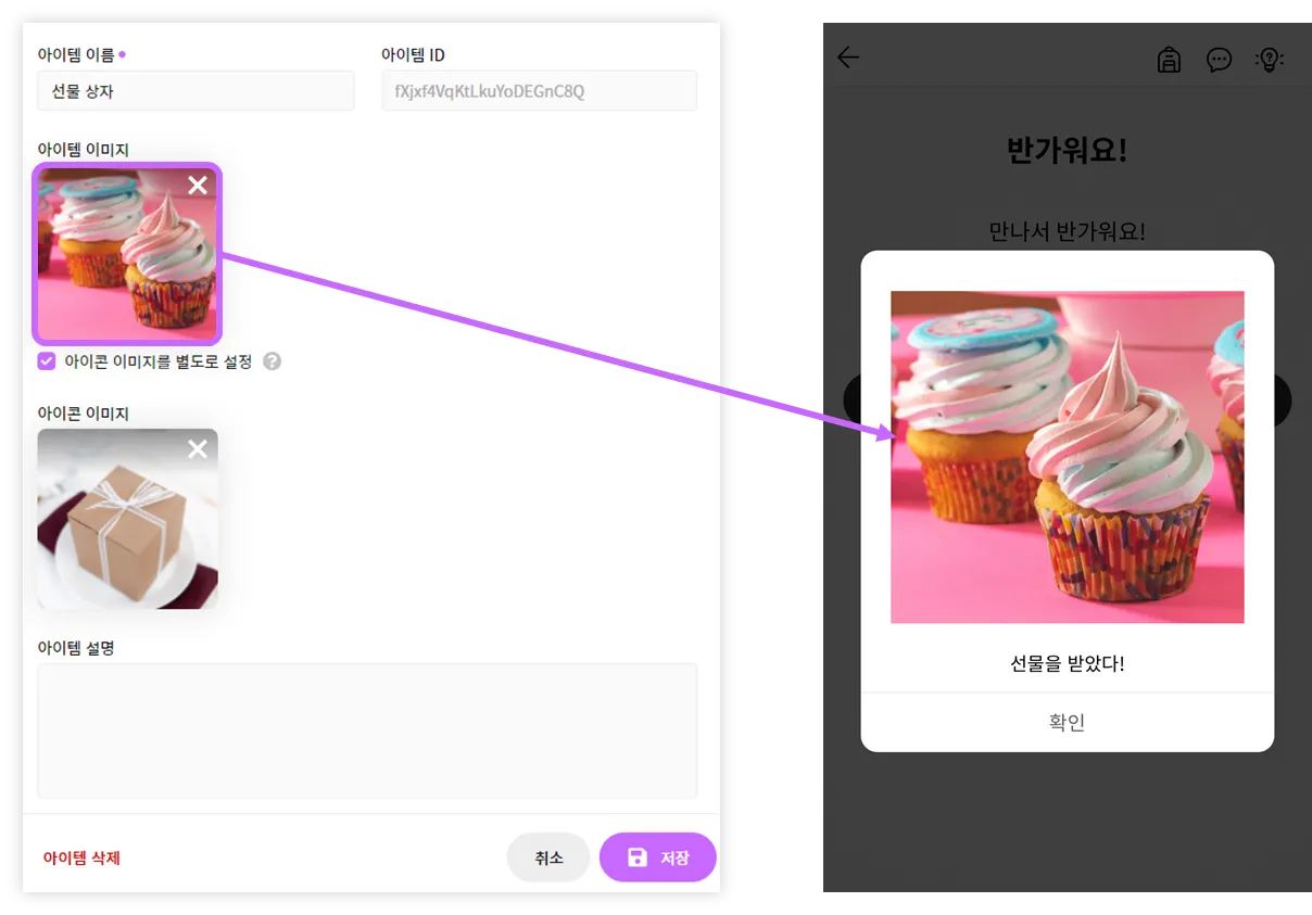 아이템 설정에서 ‘아이콘 이미지를 별도로 설정’했을 경우, 앱에서 아이템 획득 시 ‘아이콘 이미지’가 썸네일로 보여집니다.