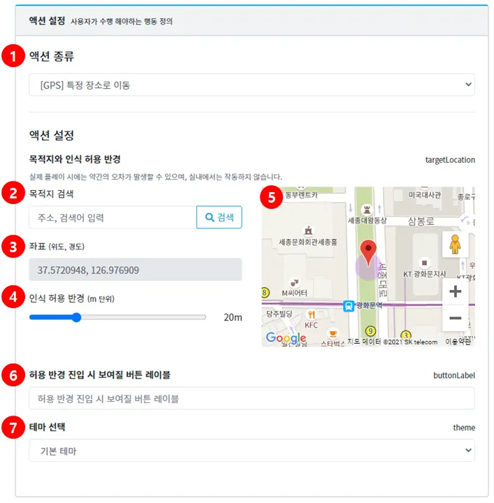목적지 좌표를 기준으로 플레이어가 몇 미터 이내로 접근했을 때, 본 액션을 성공으로 처리할 것인지를 정하는 부분입니다. 슬라이더를 움직이면 5번 지도 미리보기 화면에서도 영역 표시가 보입니다. 인식 허용 반경은 20m를 기본값으로 권장 드립니다.