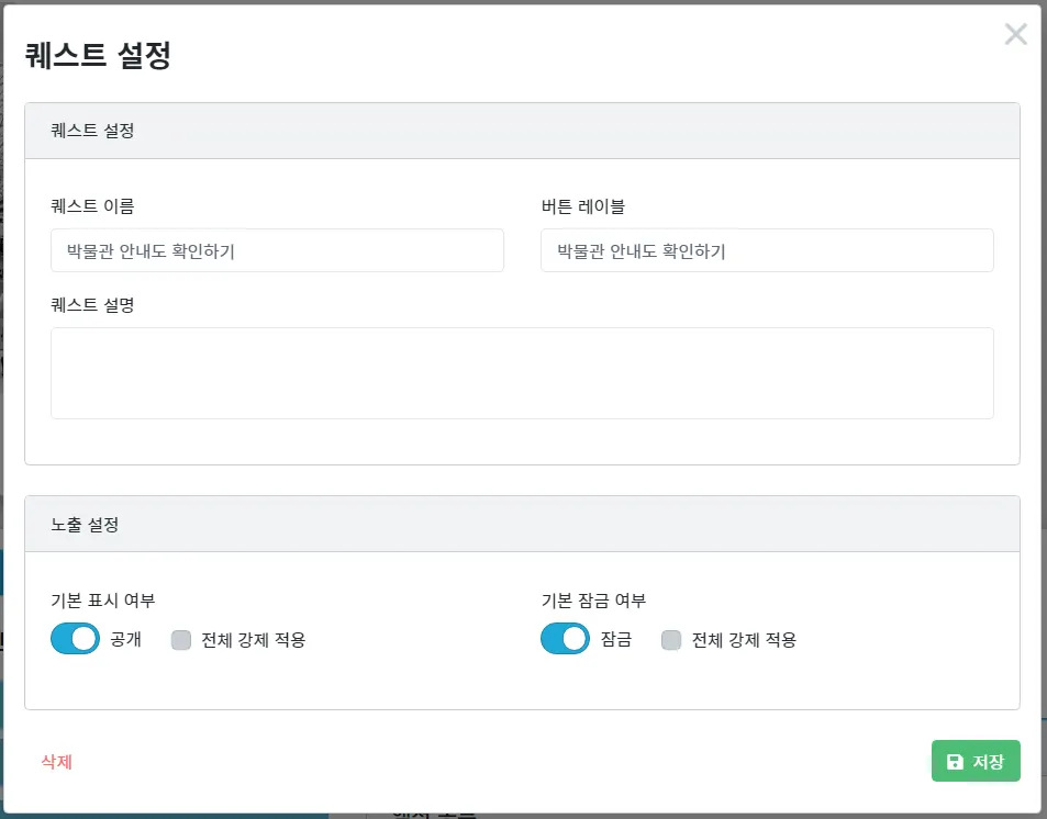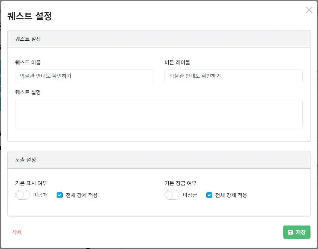 다만, 현재 공개된 퀘스트이므로 '전체 강제 적용'을 체크한 후 '미공개-미잠금'처리합니다.