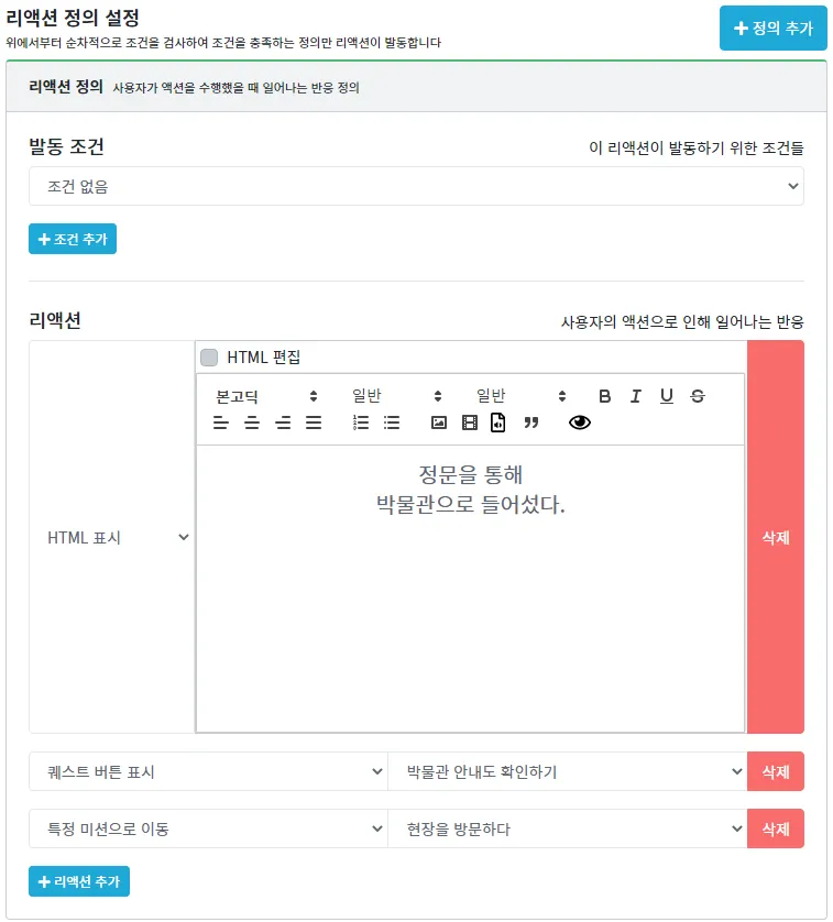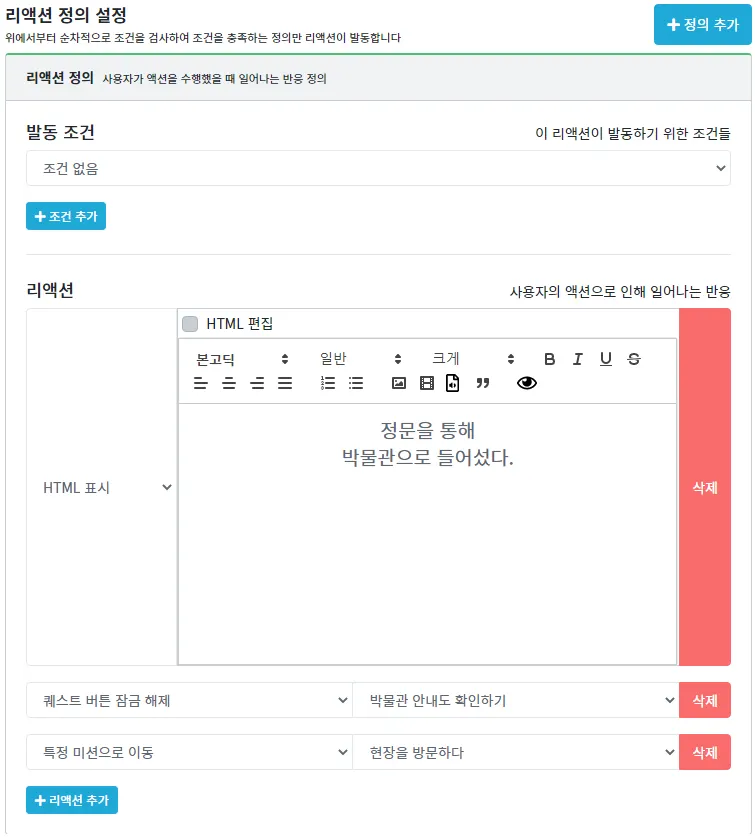 리액션 정의 부분에서 '퀘스트 잠금 해제'를 선택해 잠겨있는 퀘스트를 선택합니다.