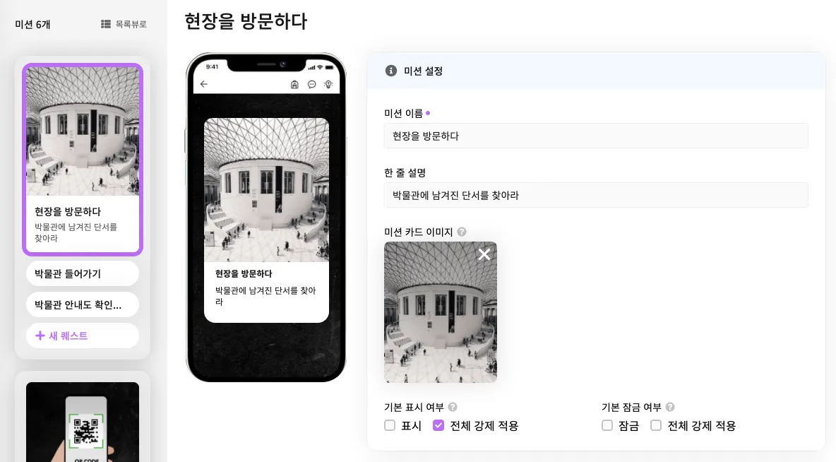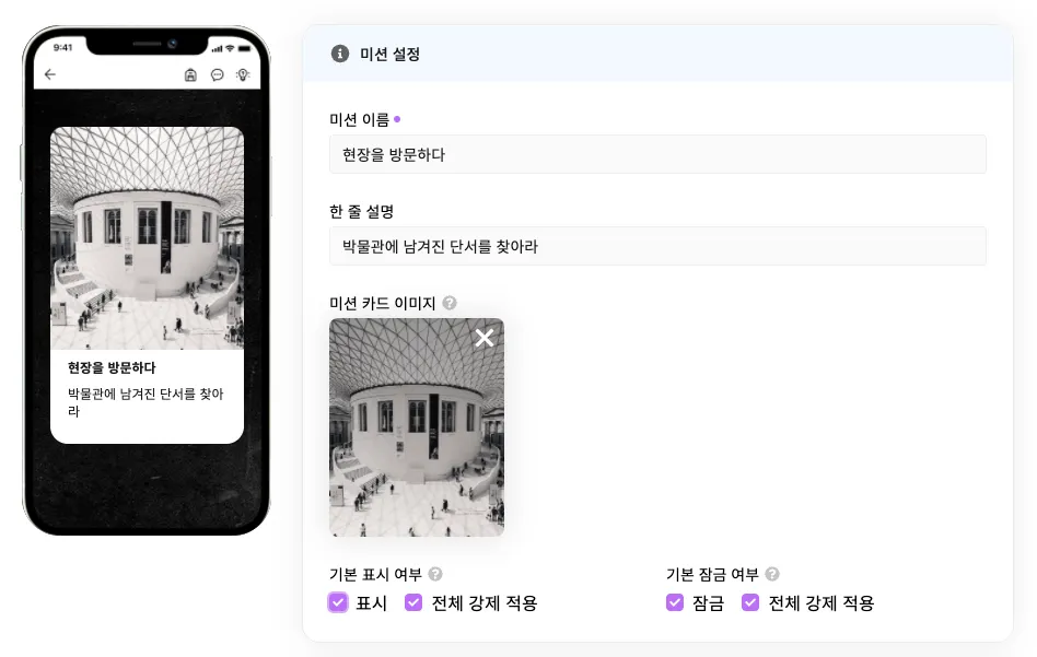 전체 강제 적용에 체크하고 저장하면 이전에 미션을 확인했던 모든 사람들에게도 미션이 숨겨져요. 테스트 단계에서만 사용하시길 권장드려요.