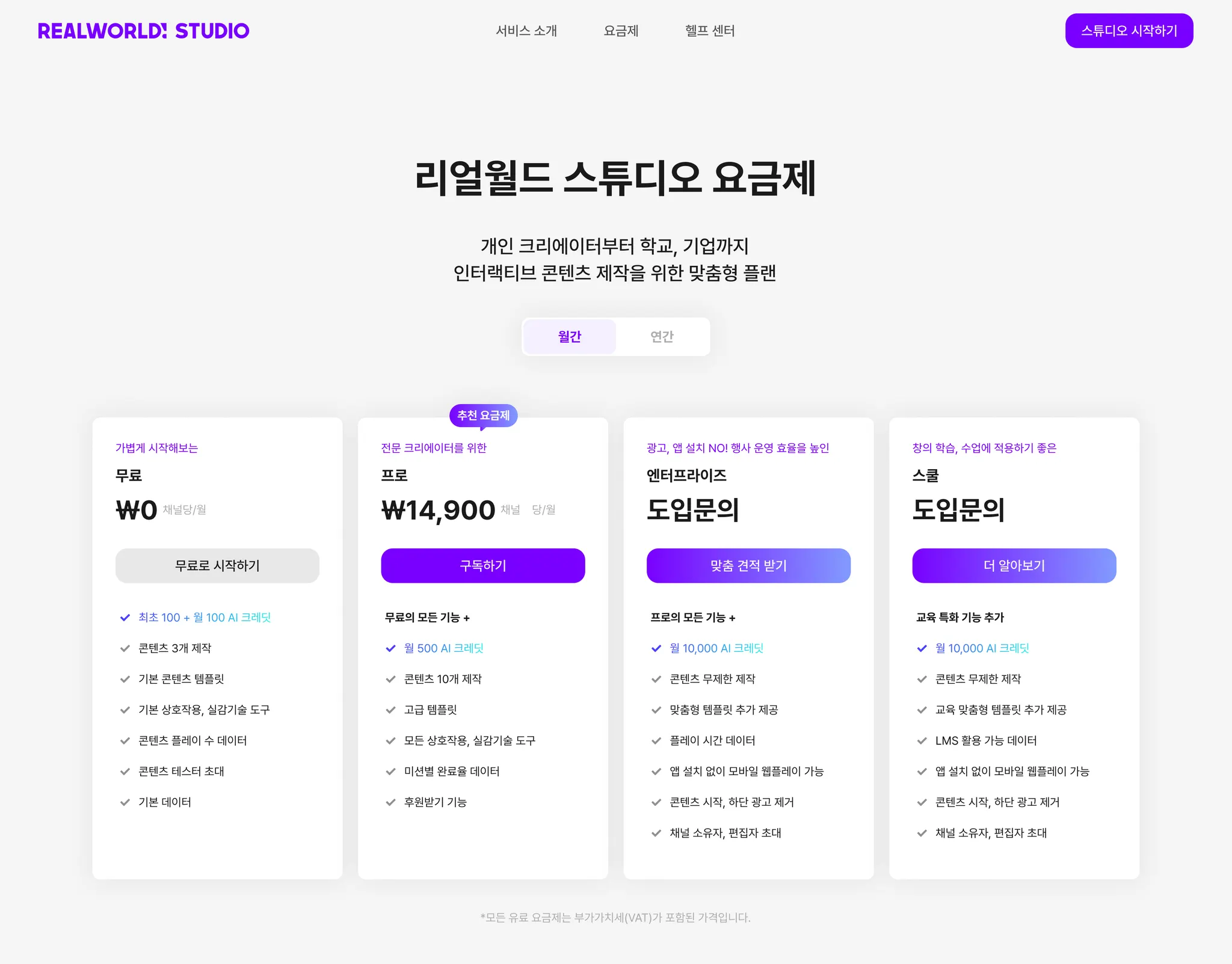 리얼월드 스튜디오 상단 ‘요금제’ 메뉴를 클릭합니다.