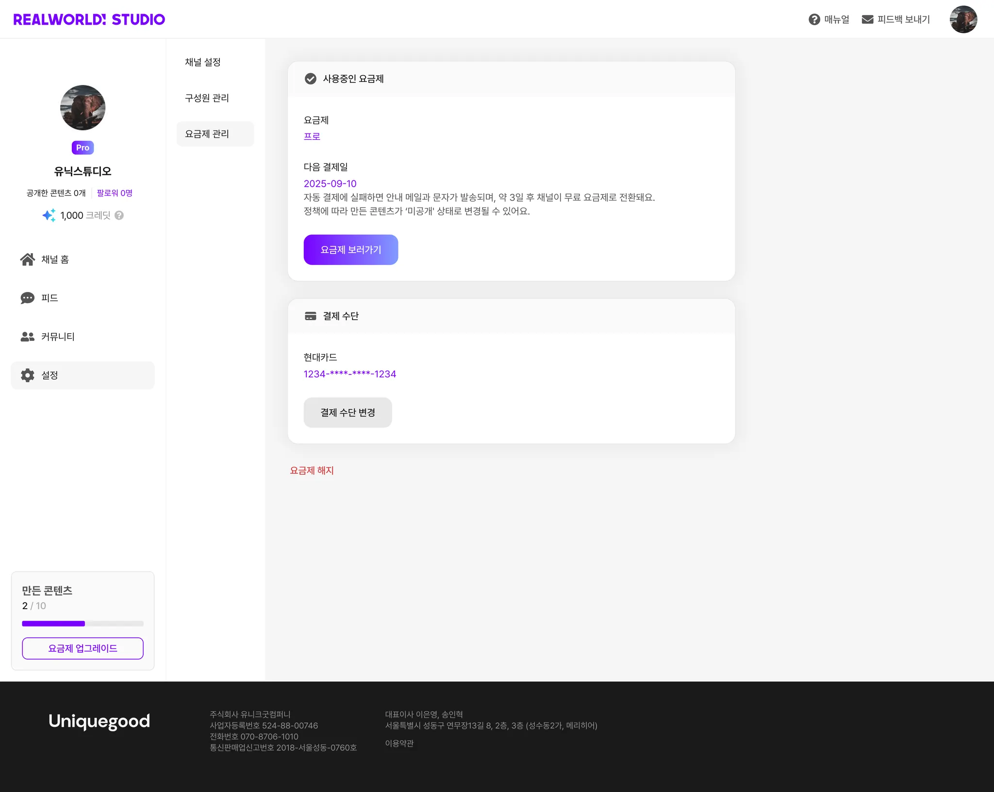 리얼월드 스튜디오 홈 > 설정 > 요금제 관리 > 하단
