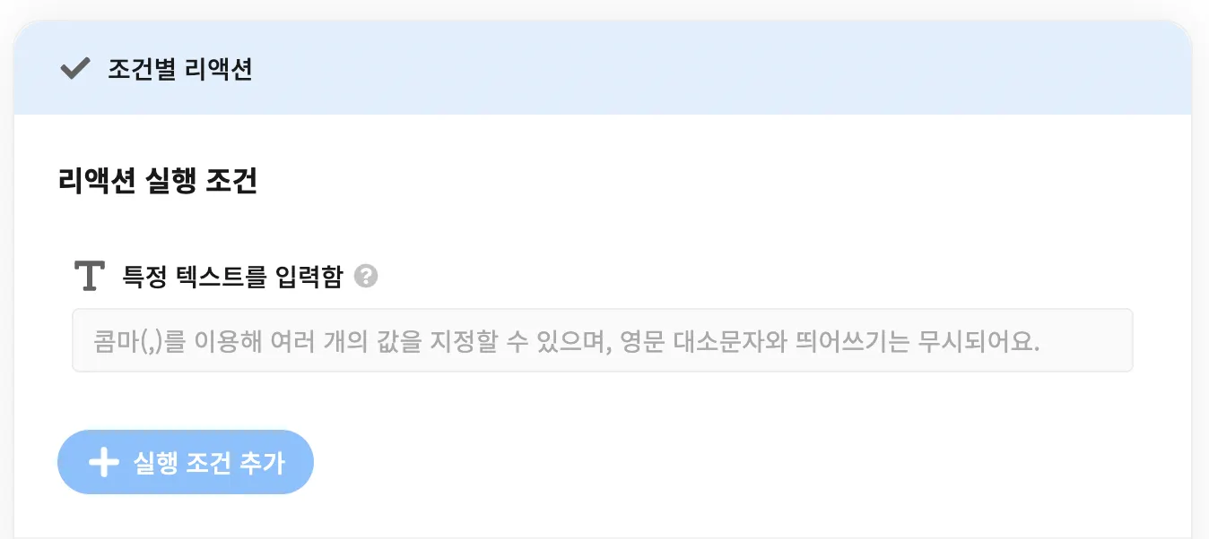 리액션 실행 조건을 특정 텍스트를 입력함으로 설정하고 텍스트 입력란에 NFC에 저장된 값을 입력해 주세요.