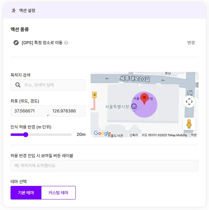 인식 허용 반경은 목적지 좌표를 기준으로 플레이어가 몇 미터 이내로 접근했을 때, 성공으로 처리할 것인지를 설정해요. 슬라이더를 좌우로 움직이면 지도 미리보기 화면에서 보라색으로 반경을 표시해줘요. 인식 허용 반경은 20m를 기본값으로 권장드려요.