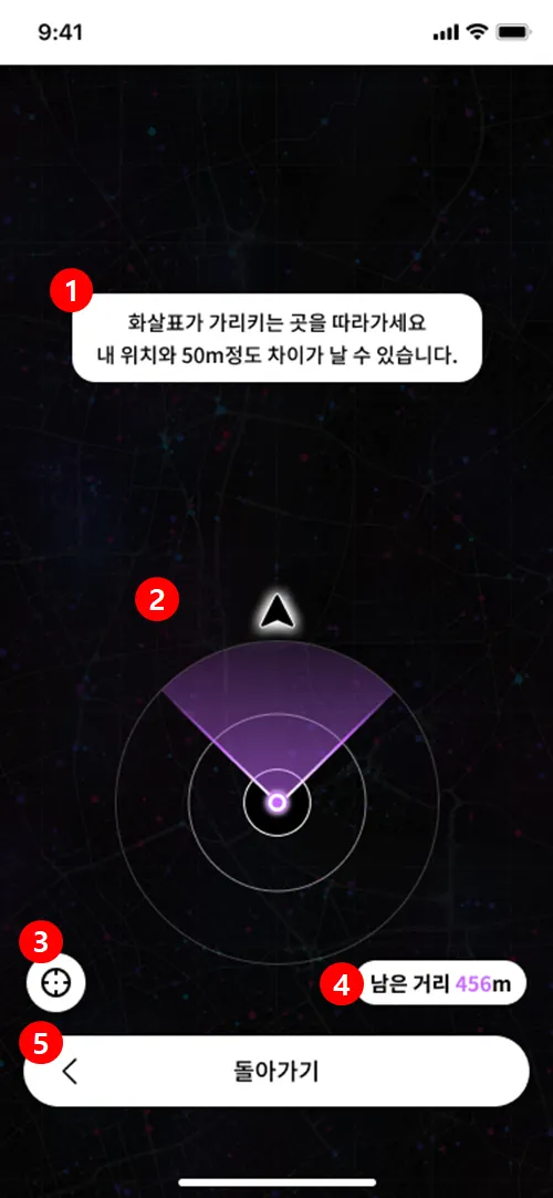 화살표가 가리키는 곳을 따라가세요. 내 위치와 50m정도 차이가 날 수 있습니다.