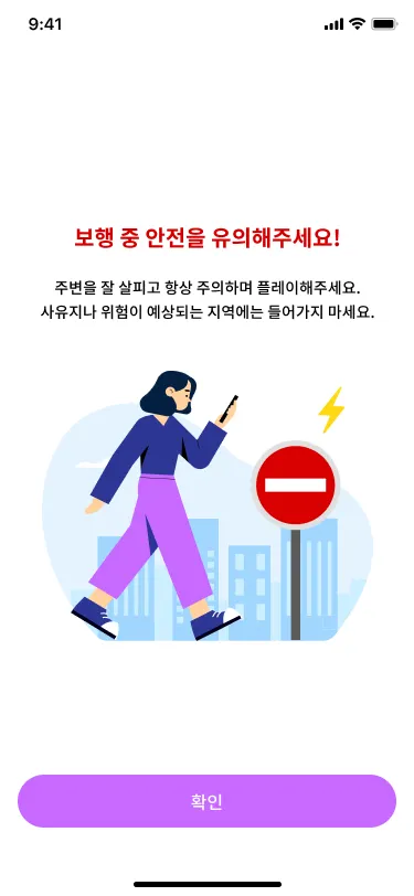 미션 화면에서 GPS 퀘스트 버튼 클릭 시, 사용자의 주의를 환기시키는 안내화면이 가장 먼저 나타나요.