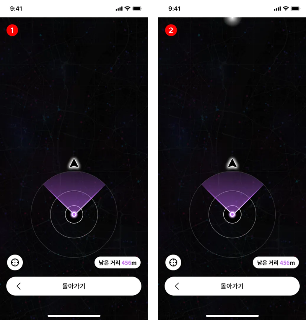 플레이어가 찾아갈 목적지가 있는 방향으로 레이더 형태의 이미지와 화살표가 움직여요.