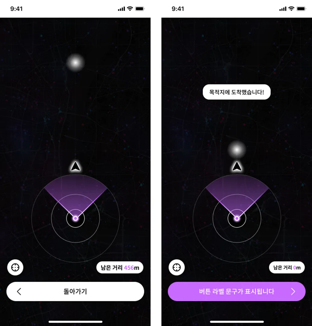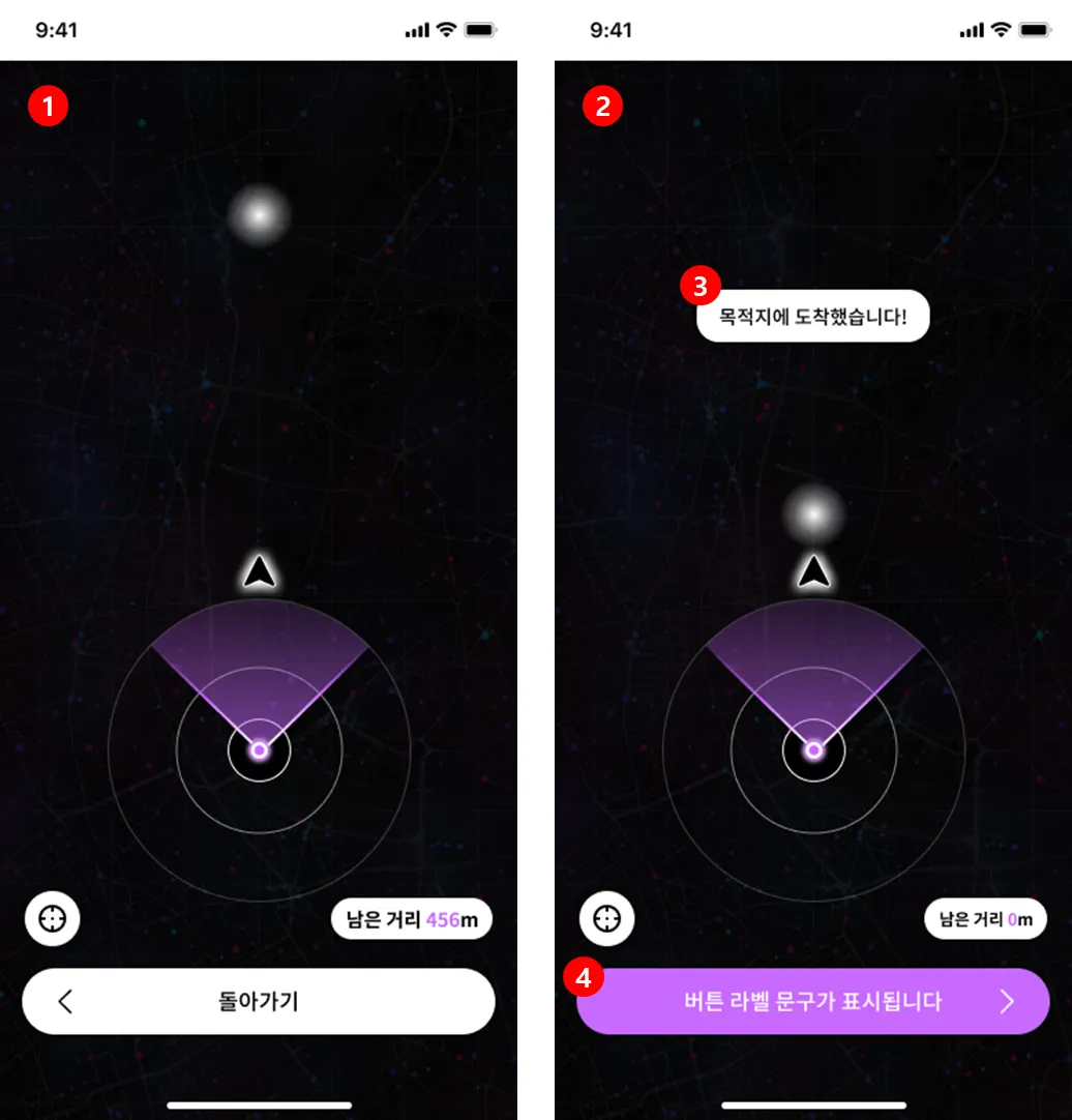 허용 반경 진입 시 보여질 버튼 레이블은 플레이어가 지정한 인식 허용 반경 안으로 진입했을 때 보여줄 버튼 문구를 설정해요. 너무 긴 텍스트는 모바일 화면에서 잘려 보일 수 있으니, 앱에서 확인해 주세요!