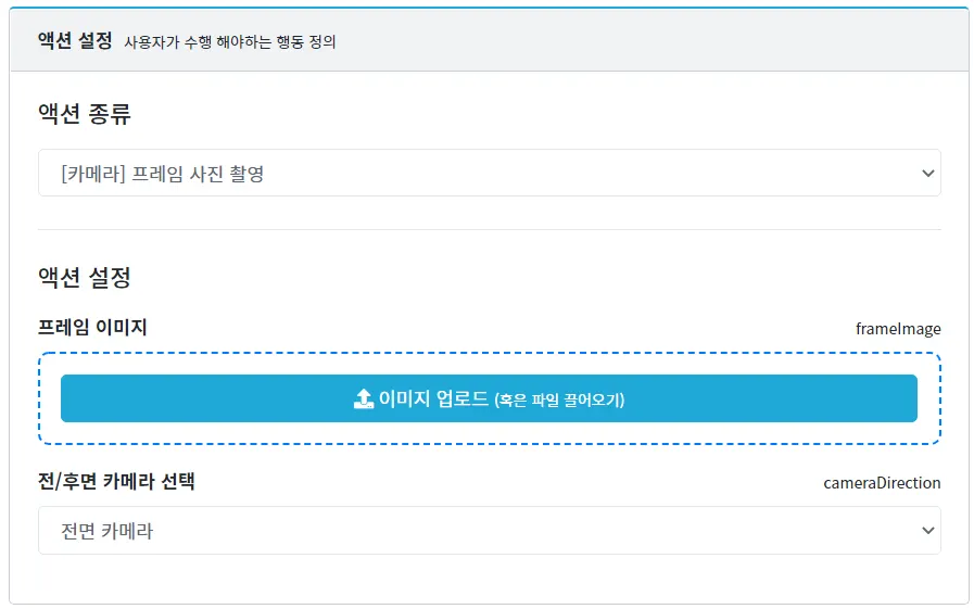 퀘스트의 액션 종류는 '[카메라] 프레임 사진 촬영'을 선택합니다.