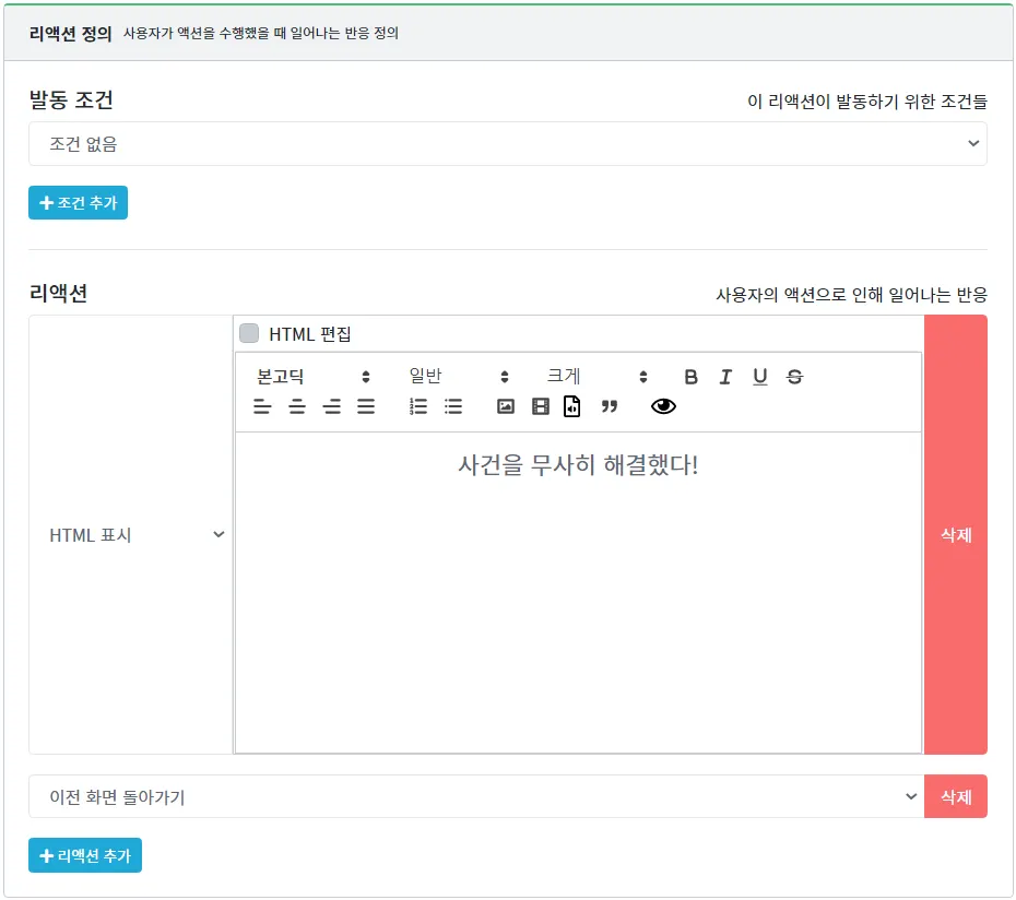 발동조건은 '조건 없음'에 체크하고 리액션은 적절히 채워줍니다.