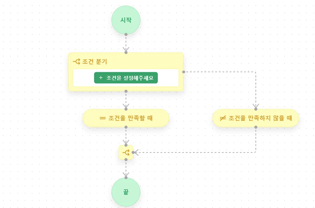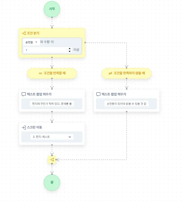 ‘조건에 따라 명령을 분기 처리하기’ 로직을 추가하면 아래와 같은 화면이나옵니다.