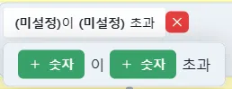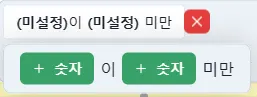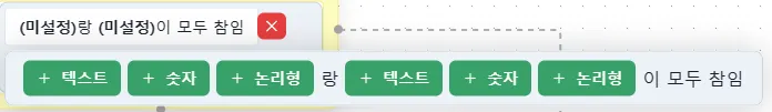 ‘~지정한 값과 일치 할 때’ 로직을 추가하면 “ ‘A’와/과 ‘B’이 같음 ”이 기본 양식입니다.