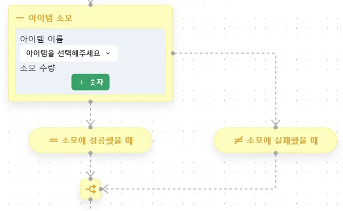 만일 양이 수량보다 많아 소모에 성공할 시 ‘소모에 성공했을 때’에 추가한 로직이 실행되고, 수량보다 적어 소모에 실패할 시 ‘소모에 실패했을 때’에 추가한 로직이 실행됩니다.