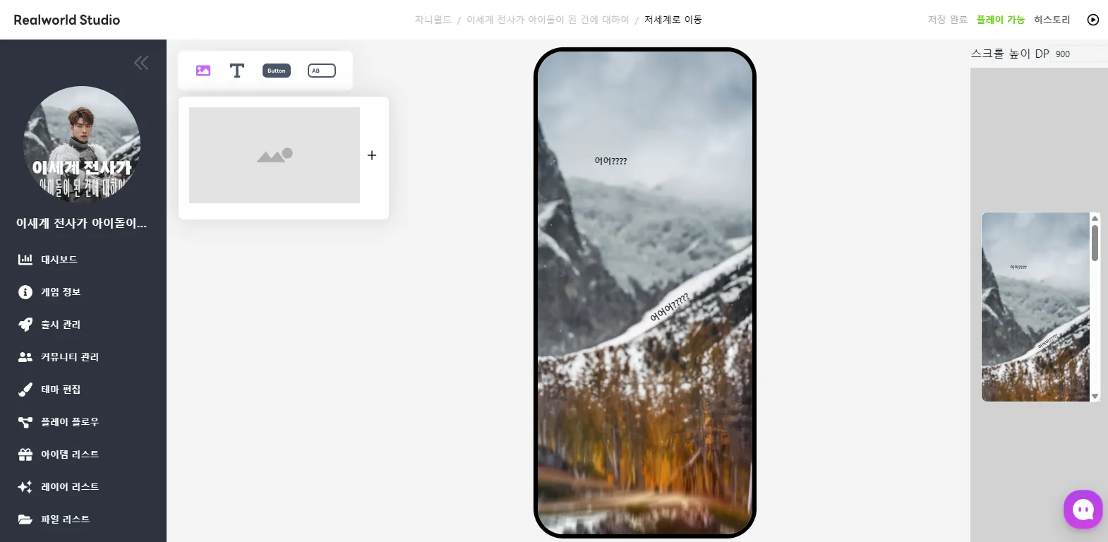 우측 중간에서는 현재 구현한 스크린이 플레이어에게 보일 미리보기를 볼 수 있습니다.