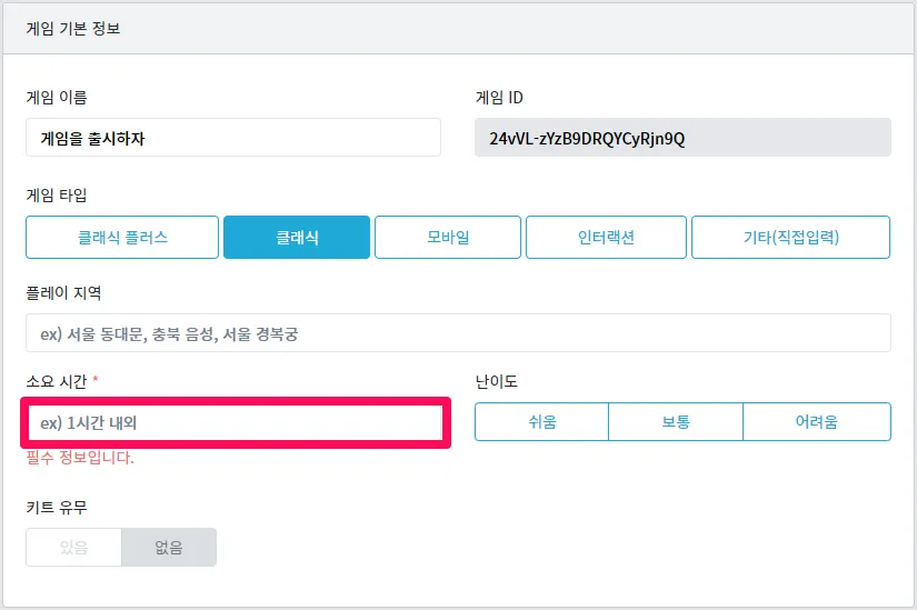 게임 정보 설정 메뉴에서 소요 시간과 스토리를 작성해주세요.