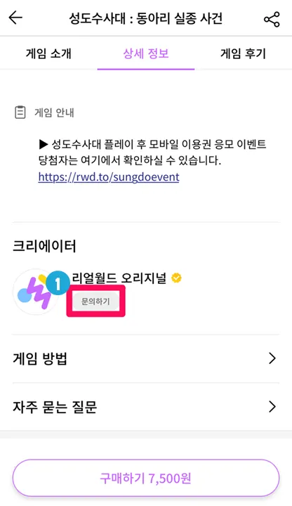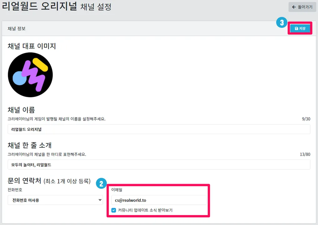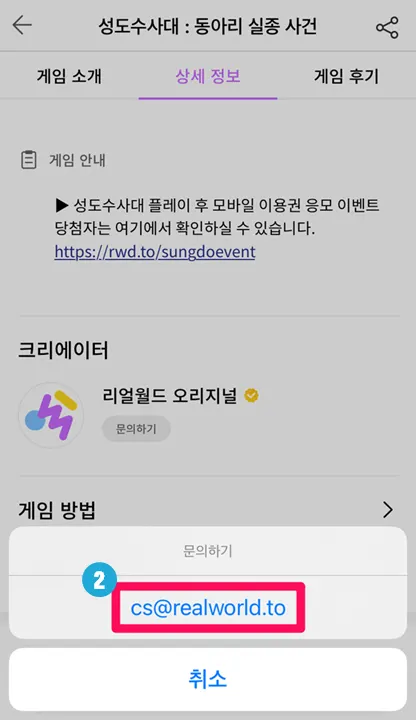 문의 연락처를 등록하면 리얼월드 앱에 출시한 게임 상세 페이지에 노출됩니다.