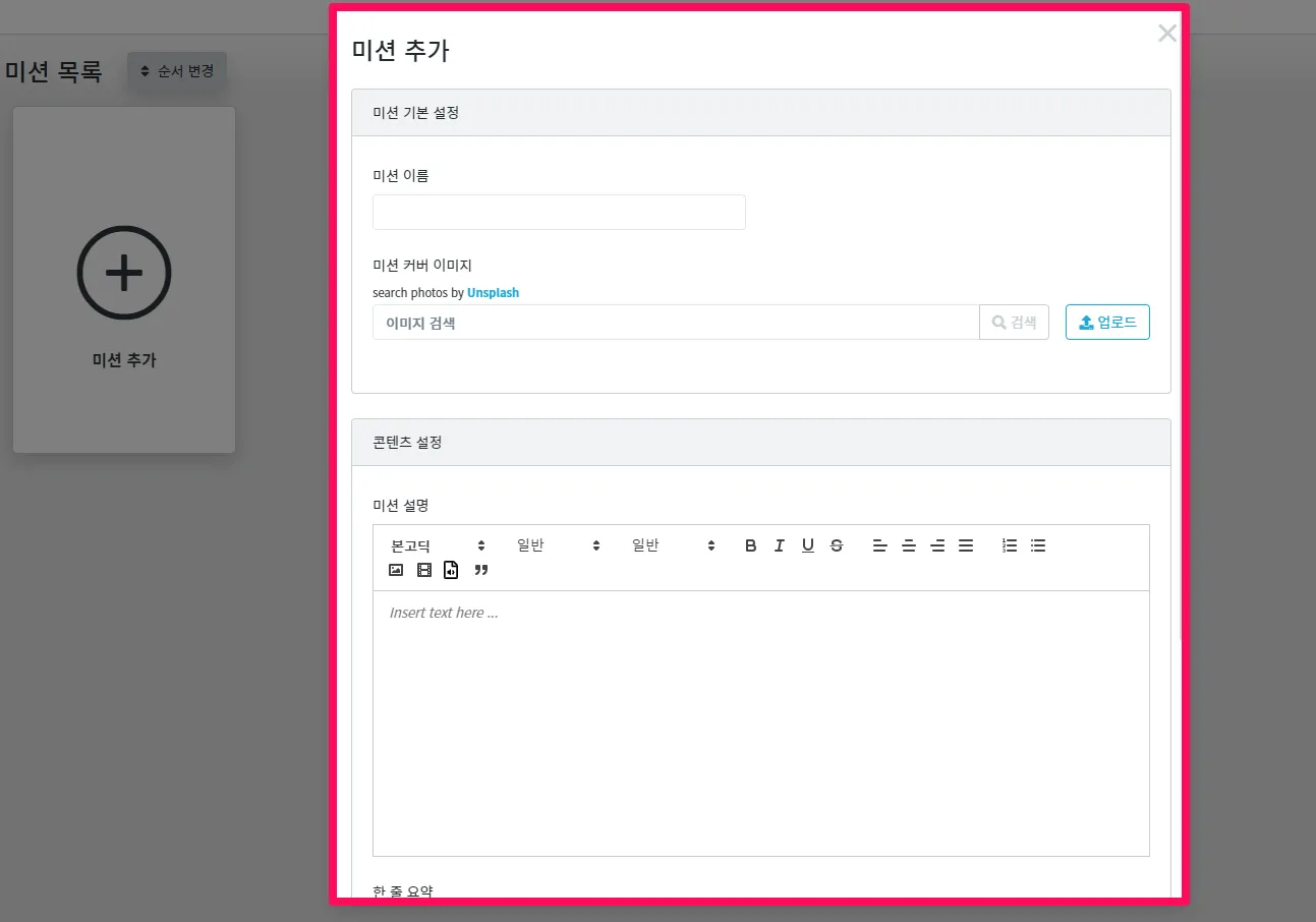미션 편집 메뉴에서 미션 추가 카드를 클릭하고, 미션 세부 정보를 입력하여 미션 카드를 생성해보세요.
