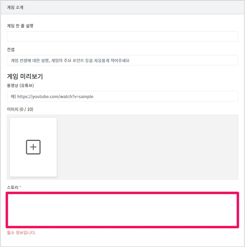 게임의 줄거리를 스토리 입력란에 작성합니다. 매력적인 스토리일수록 플레이어들의 선택을 받을 가능성도 높아집니다!
