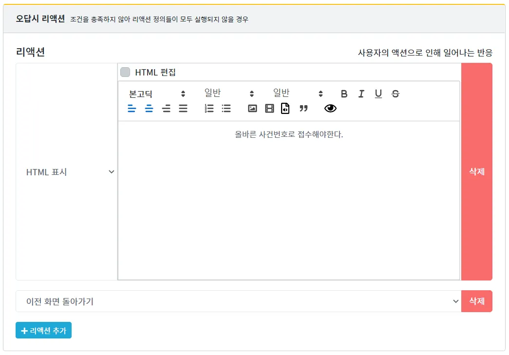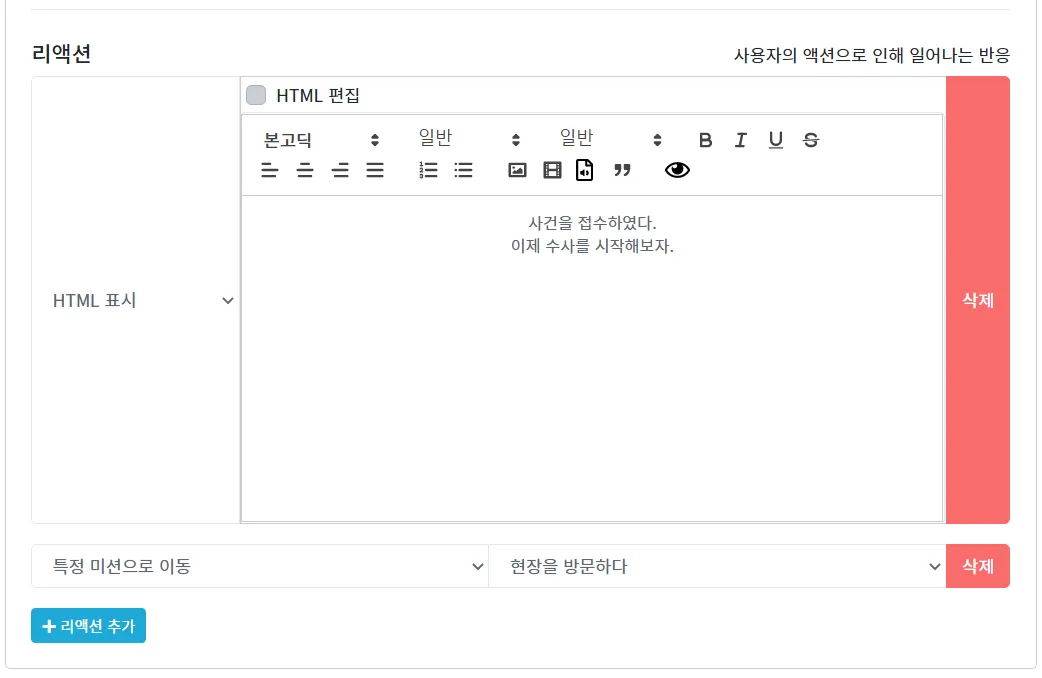'HTML 표시'는 텍스트 편집이나 이미지 삽입 등이 가능한 리액션이기에 자주 사용됩니다.