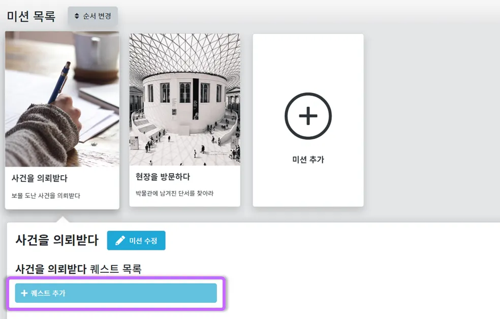 퀘스트를 생성할 미션을 선택하고 '퀘스트 추가' 버튼을 누릅니다.