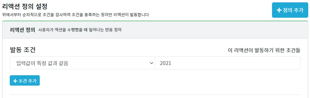 리액션의 발동조건은 '입력값이 특정 값과 같음'을 선택합니다.