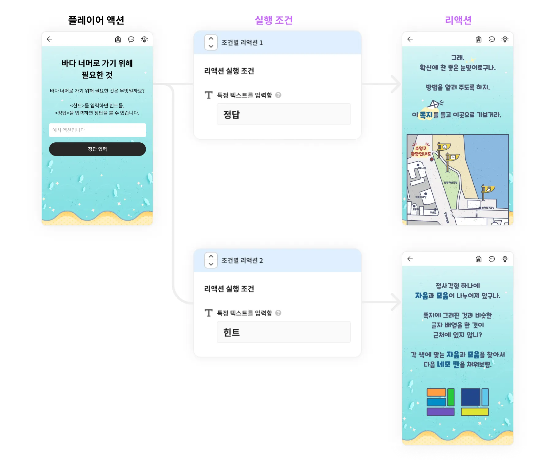 여러 개의 조건별 리액션을 추가해서 플레이어의 행동별로 다른 화면을 보여줄 수 있어요.