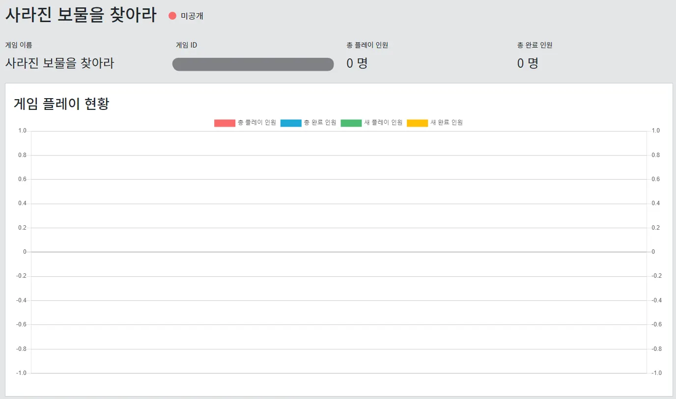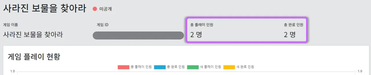 게임 시작과 종료 처리를 설정한 이후에 게임 대시보드 화면을 확인해보면, 플레이 인원과 완료 인원이 기록되는 것을 확인할 수 있습니다.