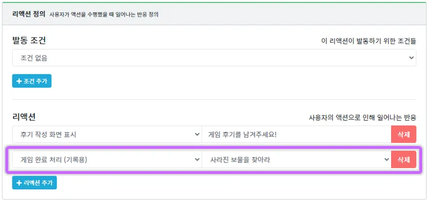 두 리액션의 차이는 게임 정보 상세페이지로 돌아가게 만드는 버튼의 유무입니다.