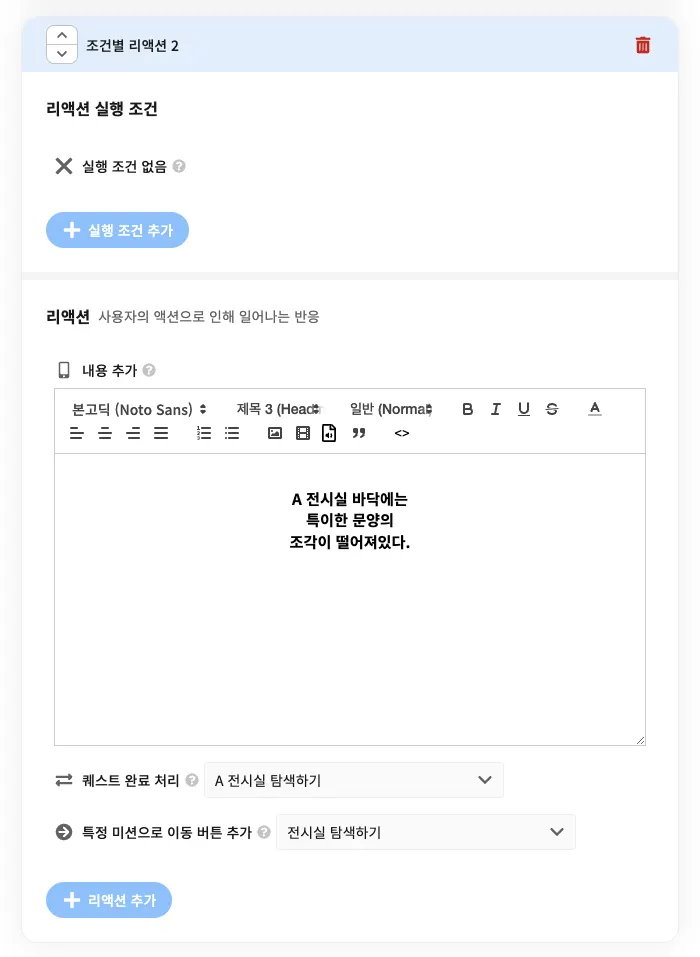 만약 정답이 있는 퀘스트를 설정할 경우 오답시 리액션도 같이 편집해 주세요. 오답시 리액션은 위의 실행조건이 모두 실행되지 않았을 때 실행되는 리액션이에요.