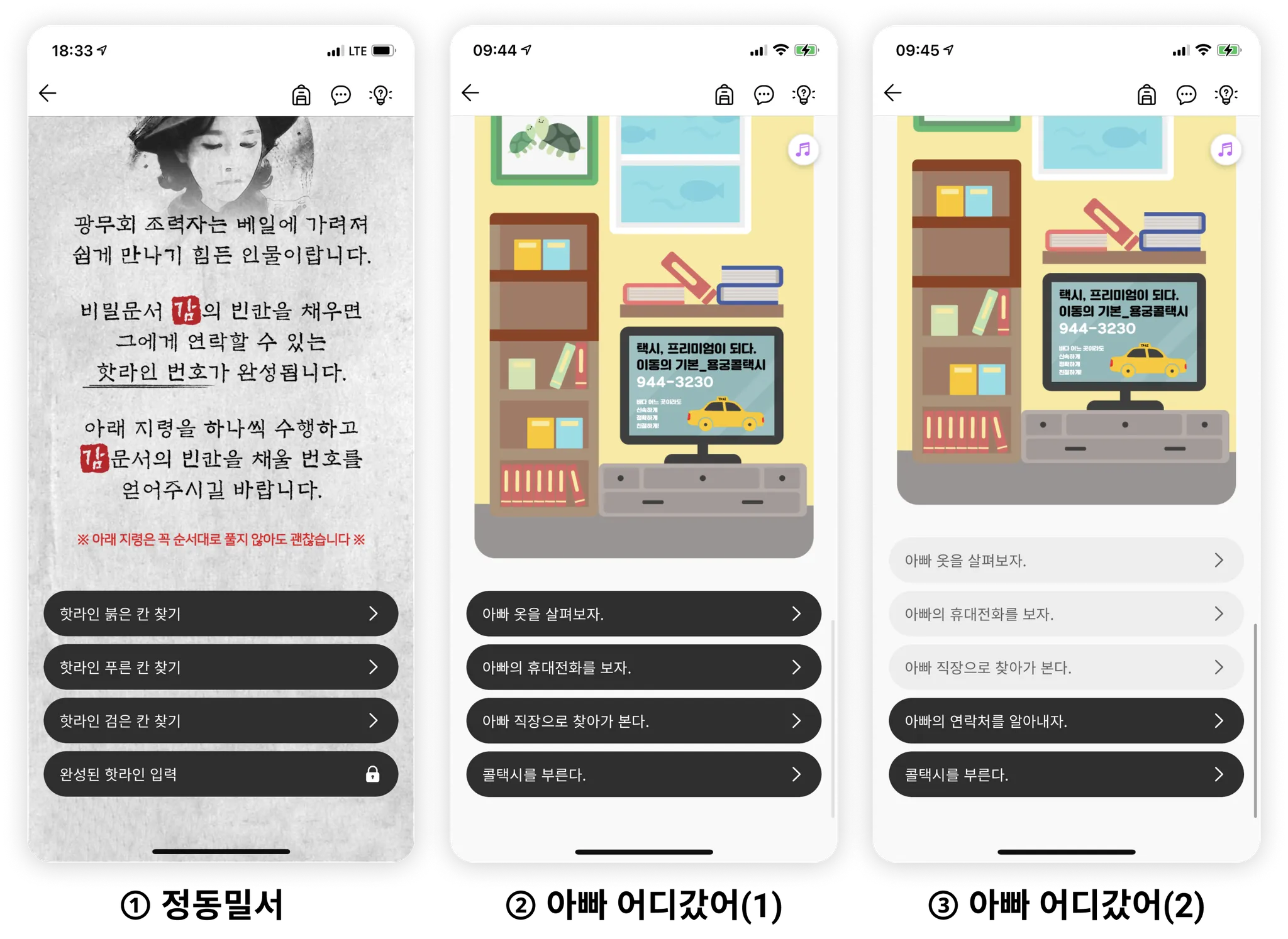 잘 살펴보시면 1.정동밀서의 마지막 퀘스트 완성된 핫라인 입력 에 자물쇠 표시가 되어있고, 2.아빠 어디갔어(1)에서는 아빠의 연락처를 알아내자 버튼이 숨겨져 있다가 3. 아빠 어디갔어(2) 에서 보여져요.