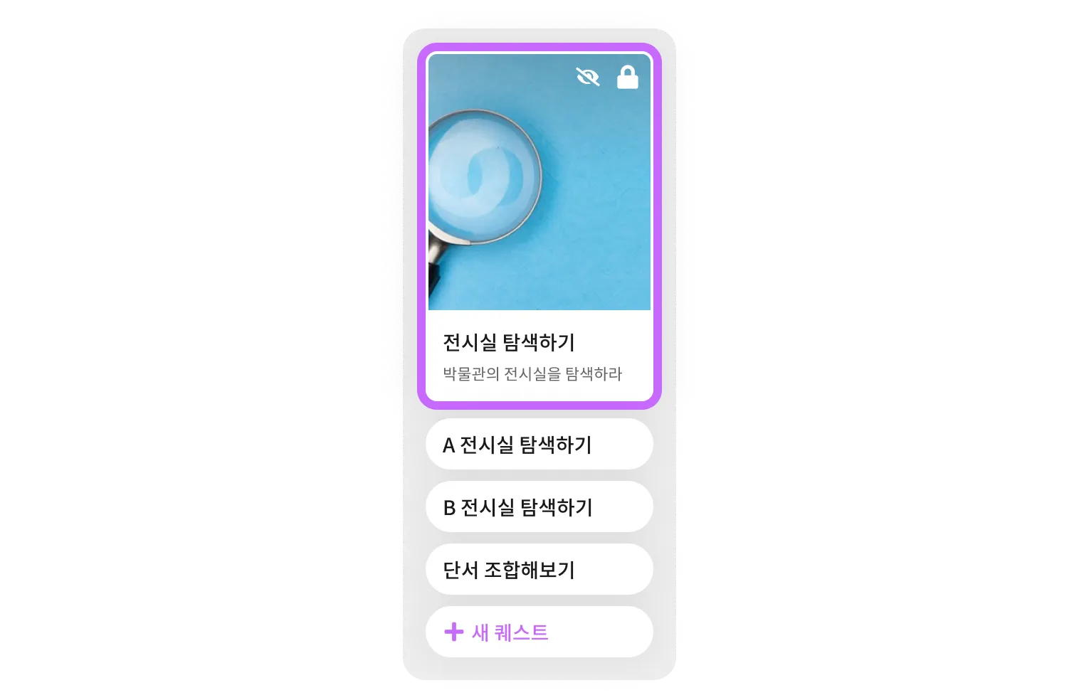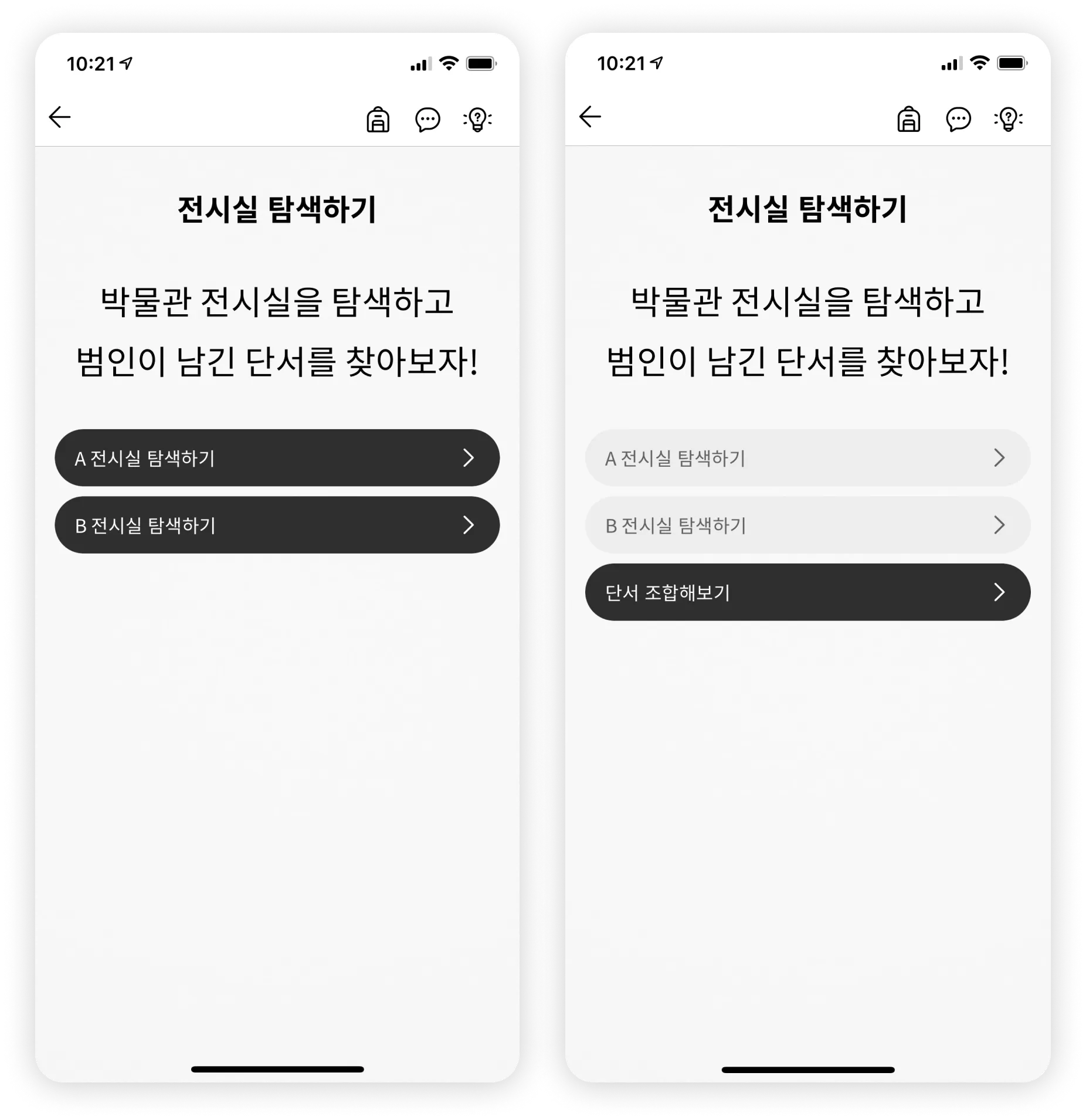 이 퀘스트를 버튼을 누른 유저는 A, B 두 전시실을 모두 탐색한 게 되므로 이 곳의 리액션으로 숨어있는 마지막 퀘스트, 단서 조합해보기가 표시되게 만들어야해요.