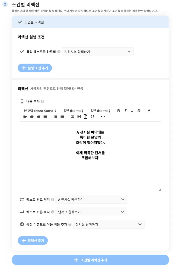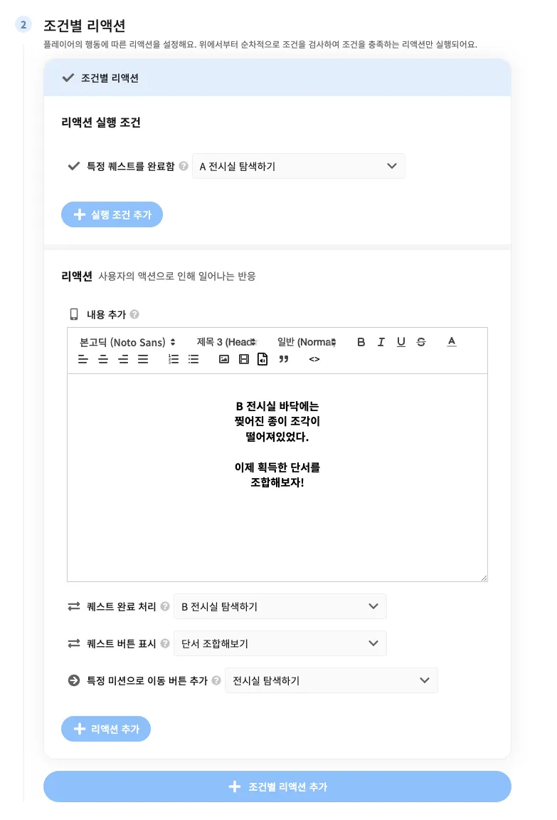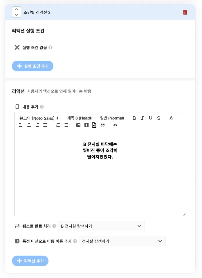 먼저 이 조건별 리액션이 B 전시실을 이미 탐색한 사람에게만 실행되어야 하므로, 실행 조건에 특정 퀘스트가 완료됨을 추가하고 B 전시실 탐색하기를 선택해주세요.