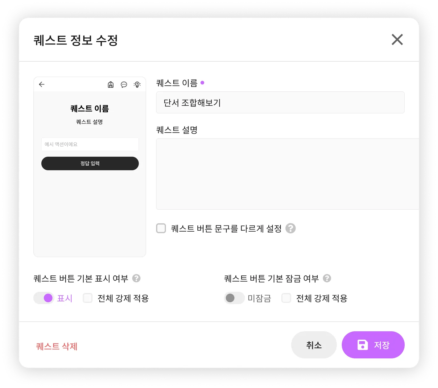 만약 퀘스트를 잠갔다가 풀리게 하고 싶다면 퀘스트의 기본 표시 여부를 표시로, 기본 잠금 여부를 잠금으로 설정해주세요.