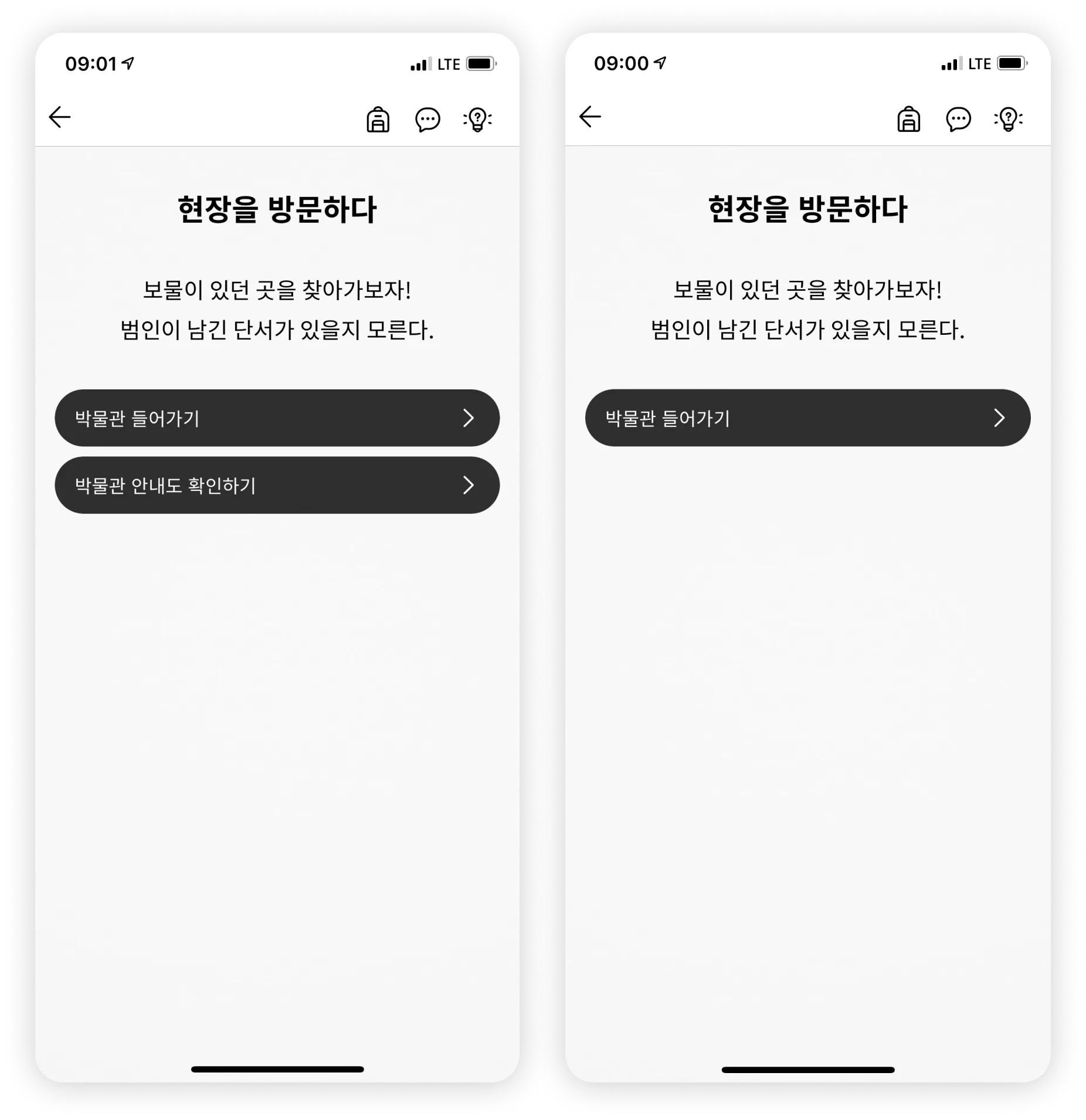 ‘박물관 안내도 확인하기’ 퀘스트가 숨김 처리 된 것을 확인할 수 있어요.