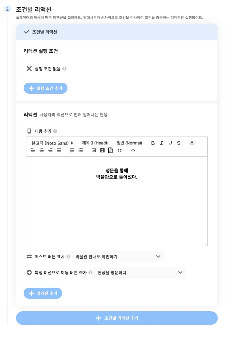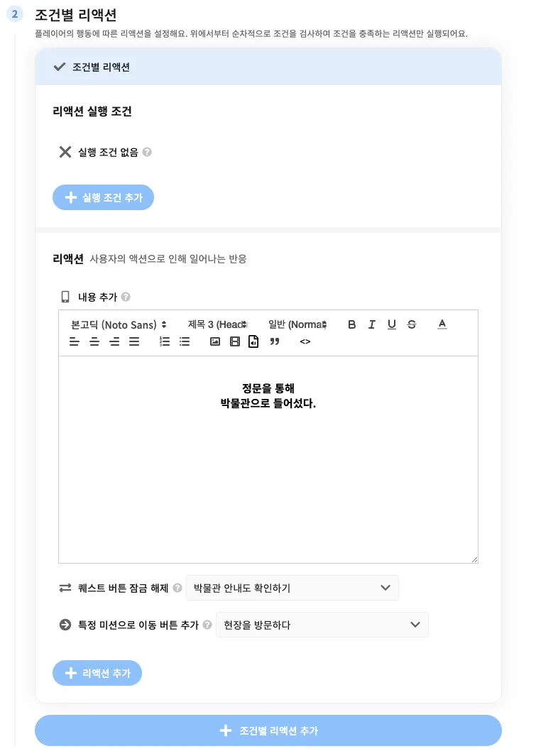리액션을 통해 'A' 퀘스트를 수행하면 'B' 퀘스트가 잠금 해제 되도록 설정할 수 있어요.
