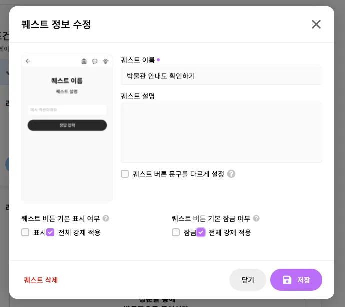 현재 공개된 퀘스트라면 전체 강제 적용을 체크하고 저장버튼을 눌러주세요.