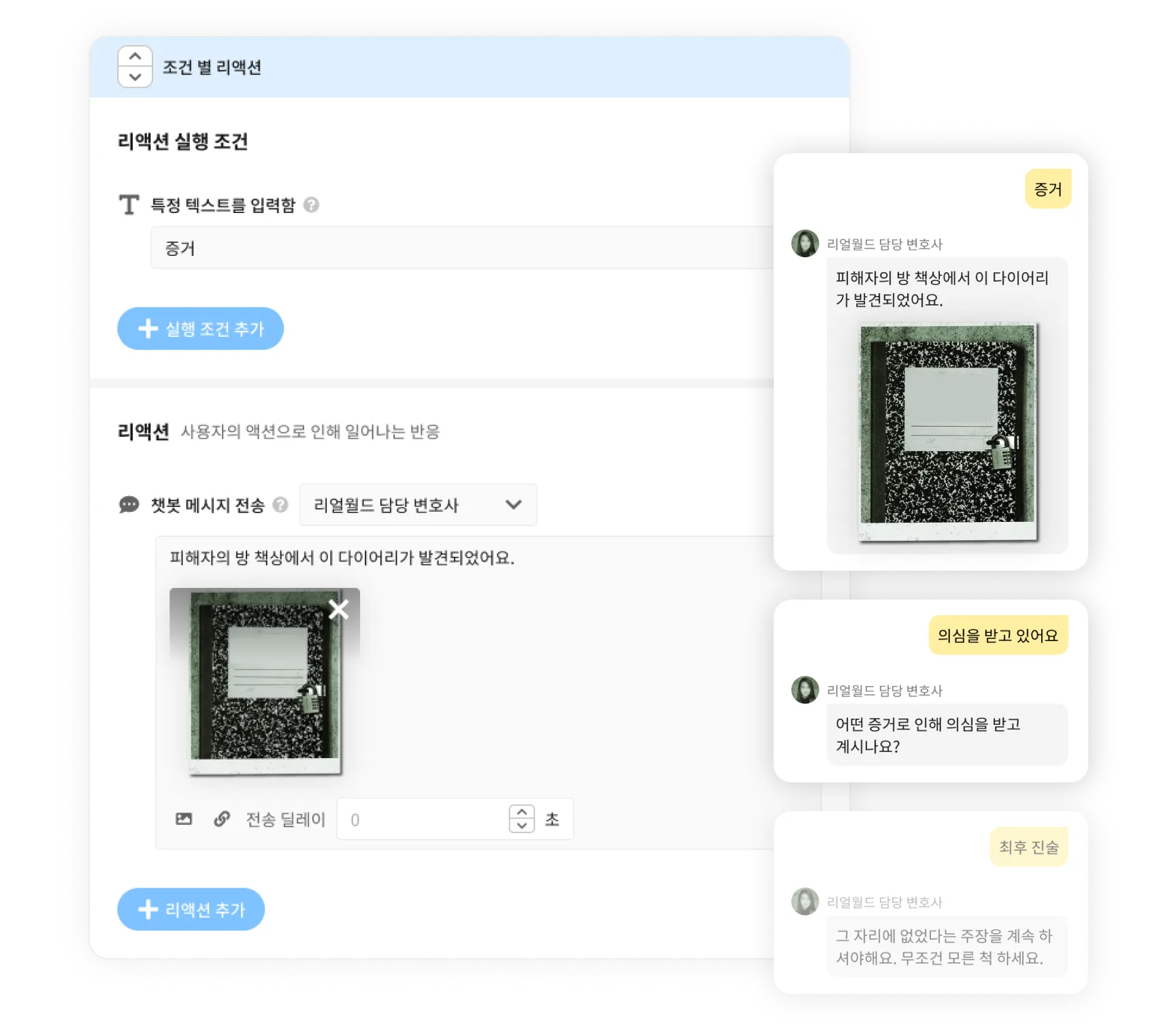 여러 개의 조건별 리액션을 추가해서 플레이어의 메시지에 따라 각각 다른 반응을 보여줄 수 있어요.