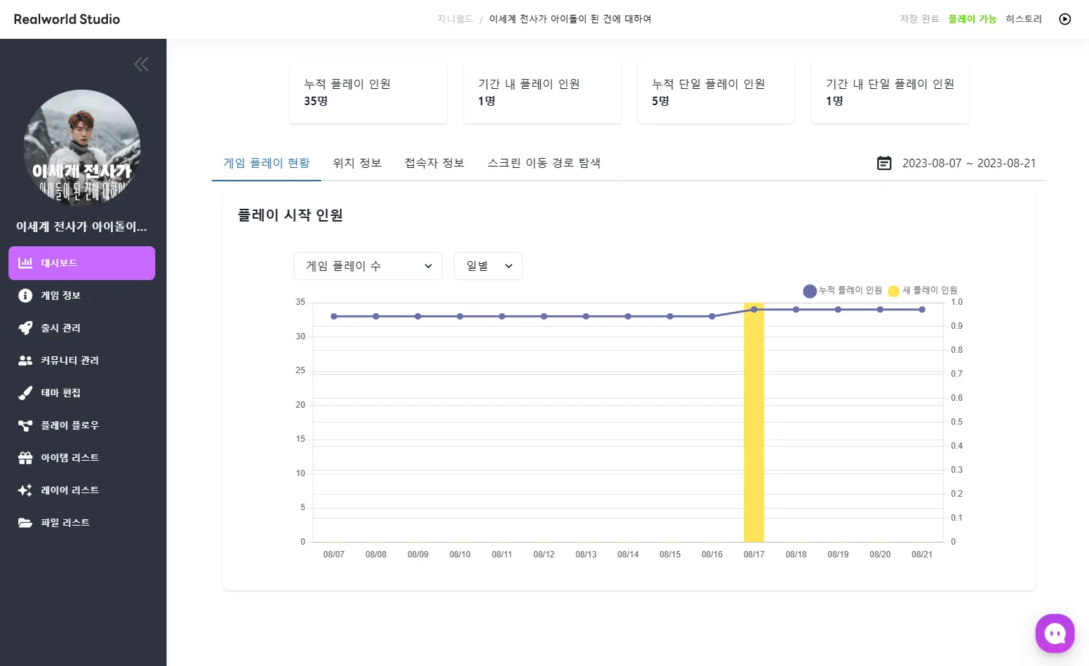 기간 내 플레이 인원 : 기간을 설정했을 때 시작 스크린에서 시작 ‘버튼’을 누른 플레이어 수 (기간 내 여러번 게임 시작을 누른다면 그만큼 인원수가 올라감)