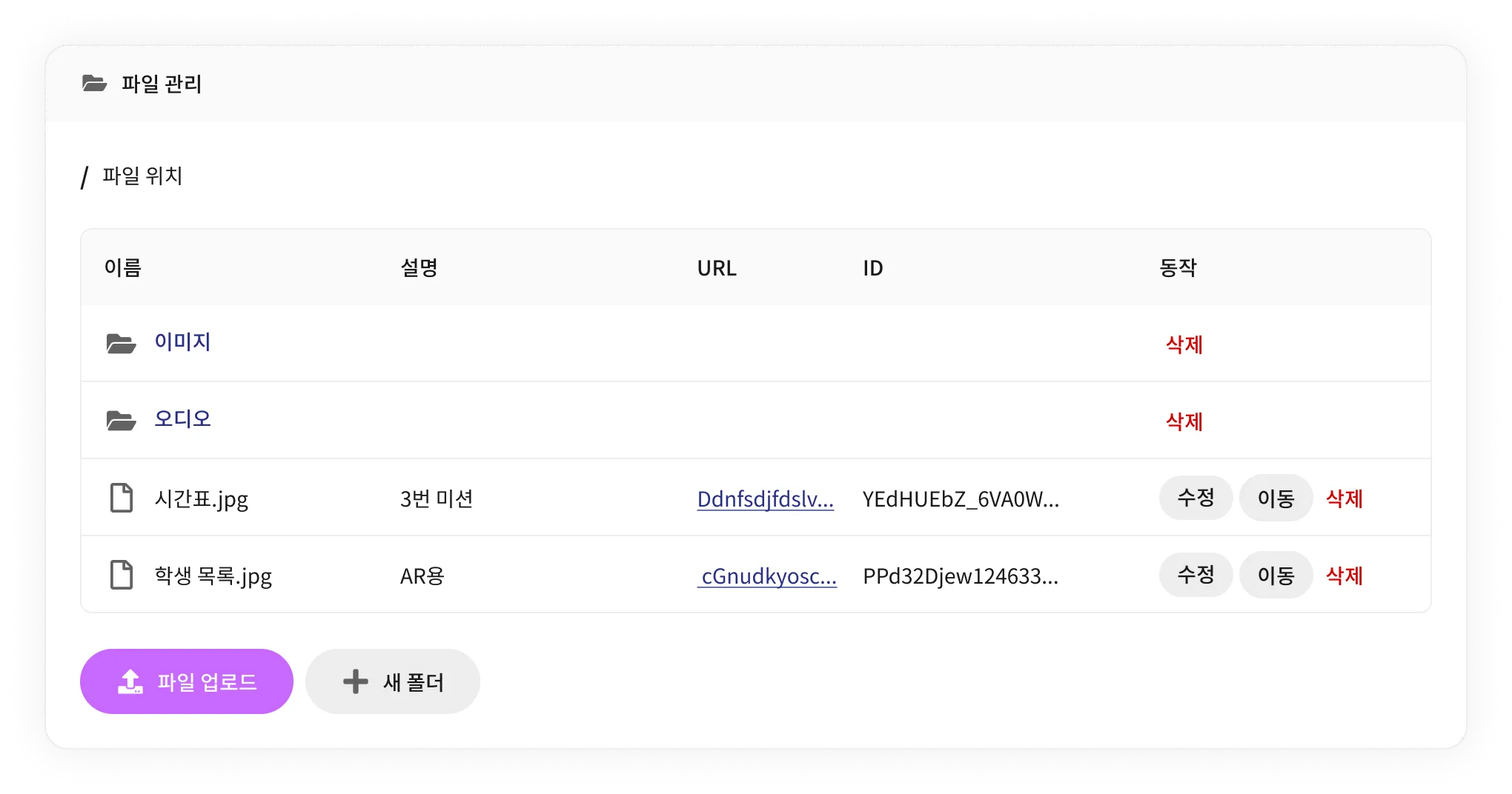 이동하고 싶은 파일의 행에서 이동 버튼을 클릭한 후, 이동할 폴더 이름을 정확하게 입력한 뒤 저장 버튼을 눌러요.