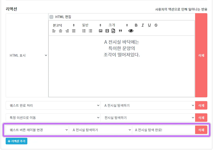 리액션을 추가하여 '퀘스트 버튼 레이블 변경'을 선택 후 글자를 변경할 퀘스트를 선택하고 바뀌어야 할 글자를 입력합니다.