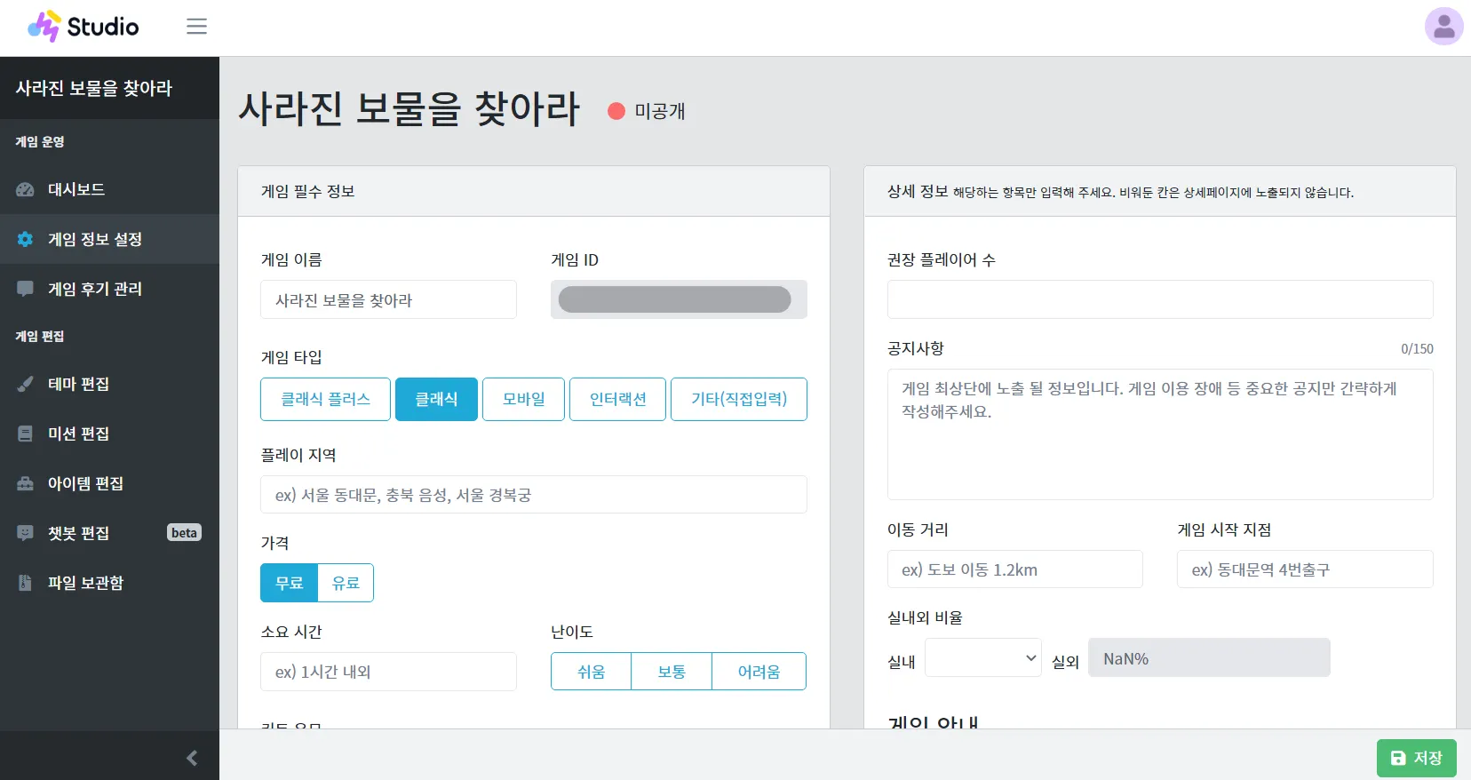 게임 정보 설정에서는 공지사항, 게임 컨셉, 스토리, 플레이 가능 시간, 미리보기 사진 및 동영상 등 게임을 플레이하는데 필요한 정보를 작성할 수 있습니다.