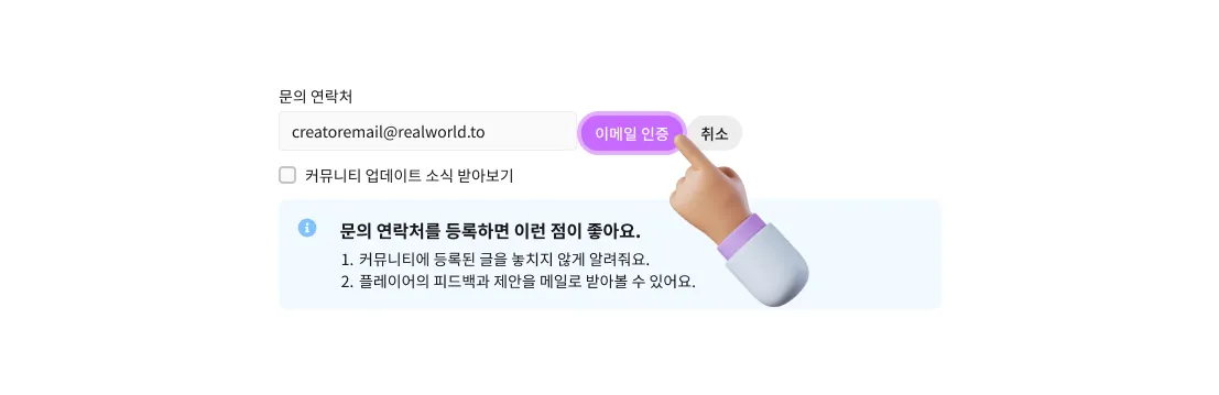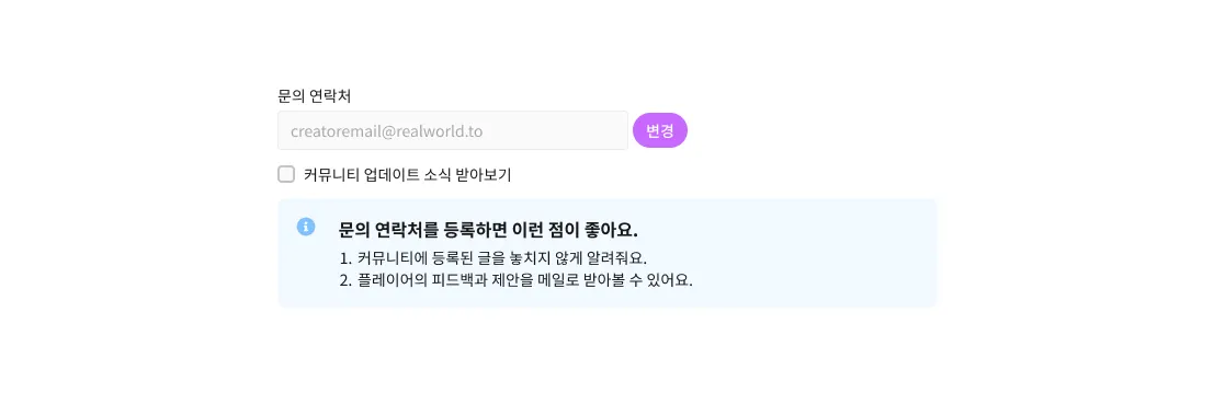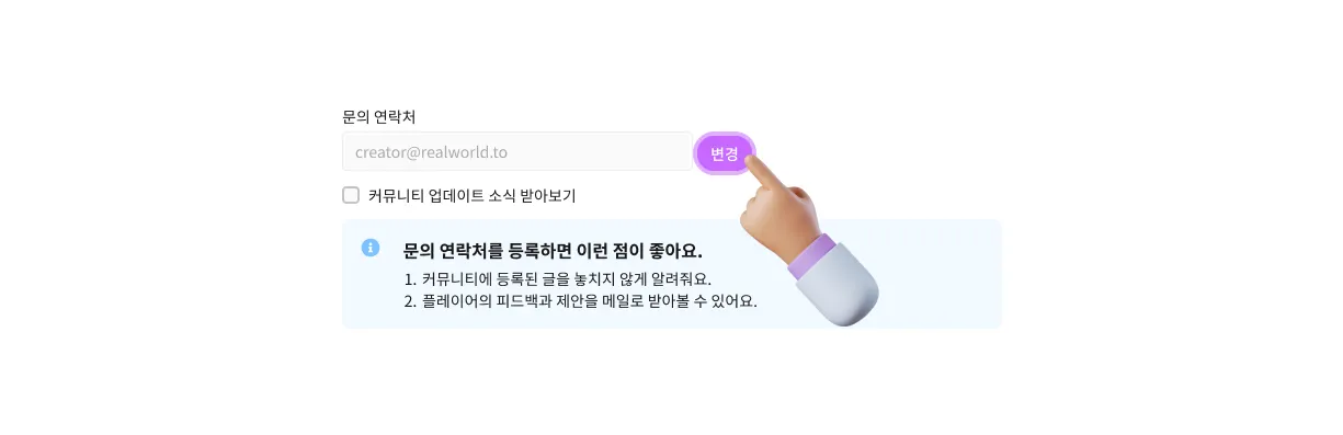 문의 연락처는 리얼월드 앱에 게임을 출시했을 때 크리에이터 정보에 공개되는 이메일이에요.