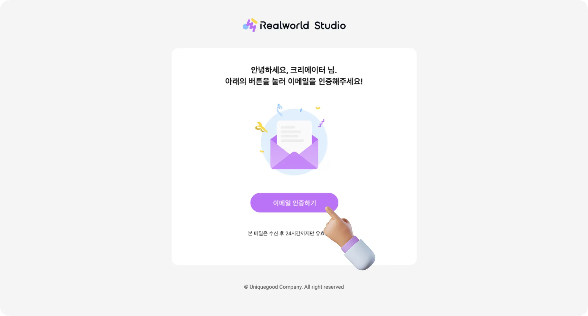 이메일의 메일함에서 인증 메일을 확인하고, 이메일 인증하기 버튼을 눌러 인증을 완료해주세요.