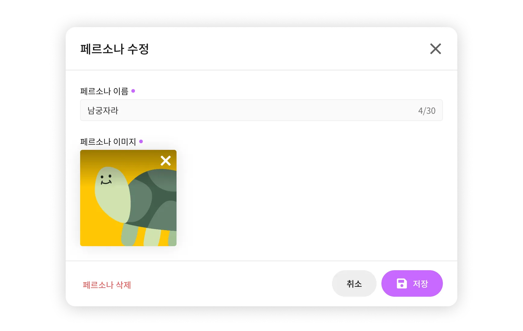 페르소나 수정 팝업이 나오면 페르소나의 이름와 이미지를 수정할 수 있어요.