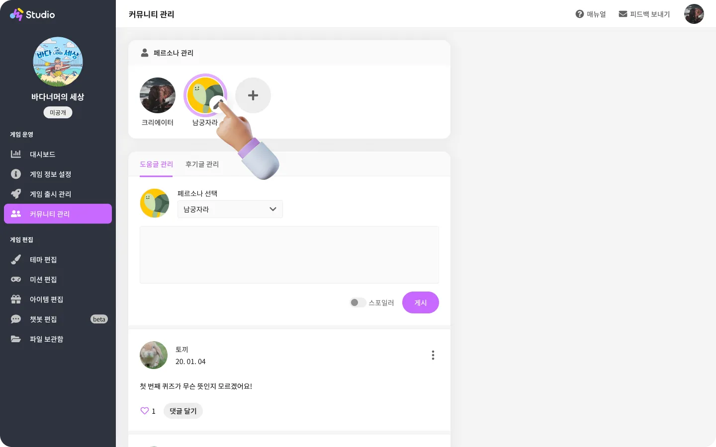 게시 버튼을 누르면 해당 페르소나로 도움글이 게시되어요.