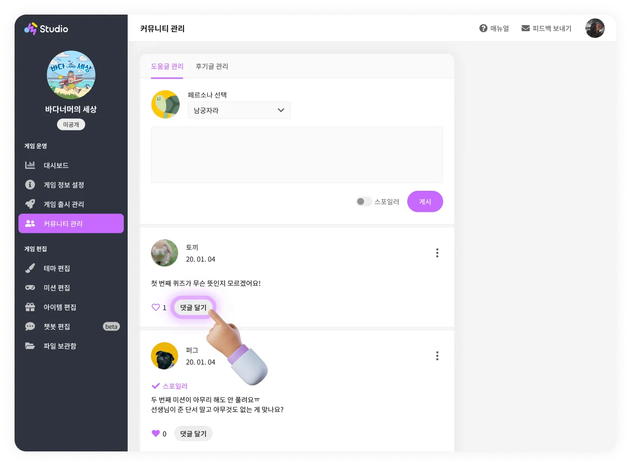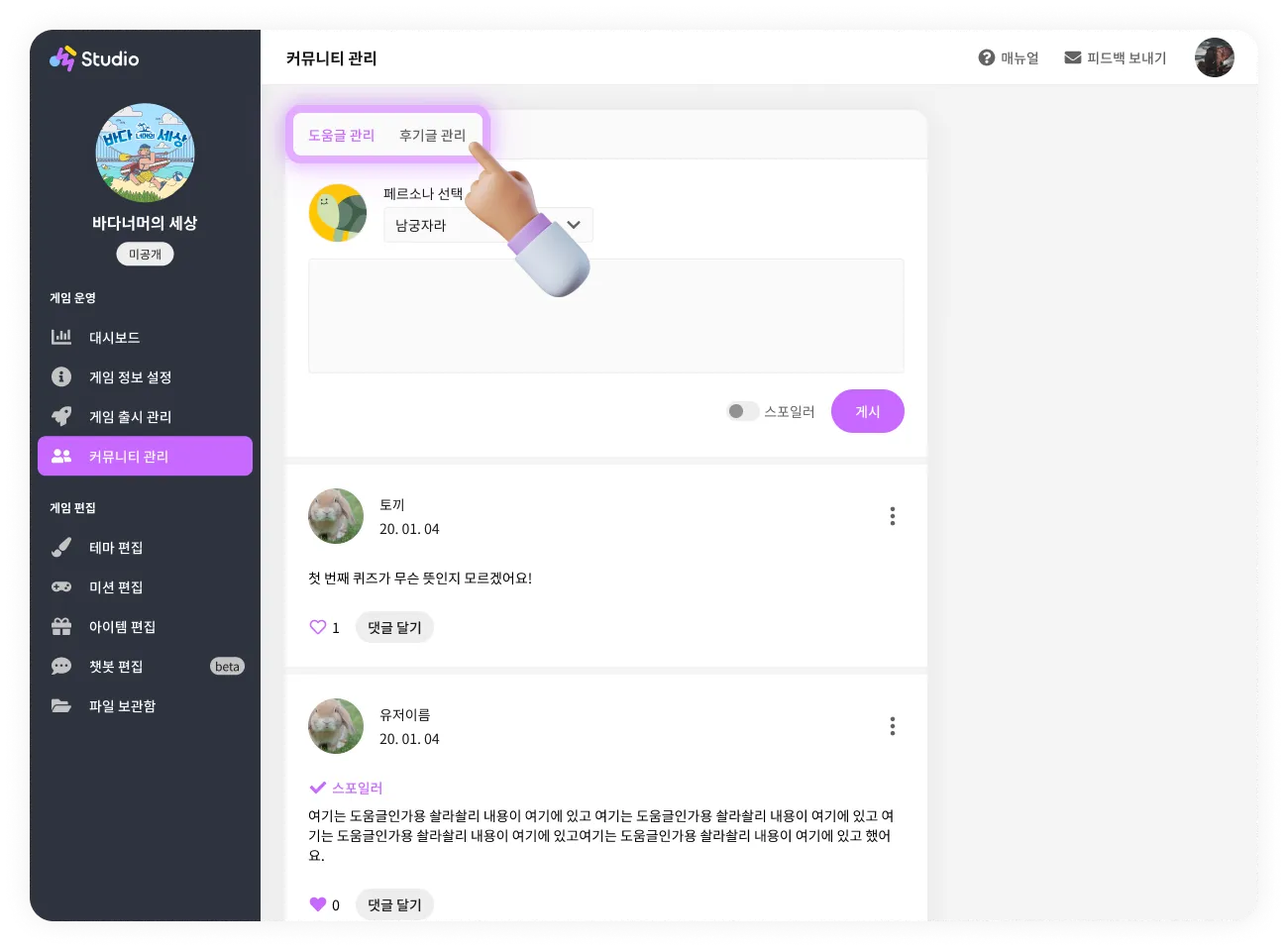 커뮤니티 관리 페이지에서는 게임에 달린 도움글과 후기글을 관리할 수 있어요.